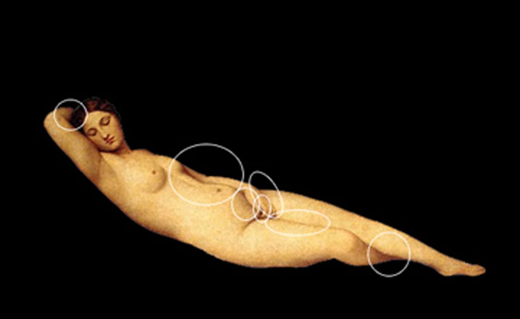 Montreal-based artist Michelle Lacombe works more generally with images from Western art history, in particular canonical images of female figures. She considers her works “interventions into the body” rather than acts of self-harm. In 2010’s “The Venus Landscape,” she had strategic lines tattooed on her body which, when properly aligned, place her in the same pose as Georgione’s “Sleeping Venus.” Her 2012 work “Portrait of a Self Memorial and an Anonymous Aesthetic Beheading,” saw her seated on a plinth with a scar along her upper torso referencing the measurements of a classical sculptural bust.