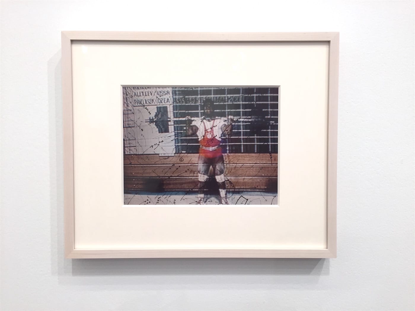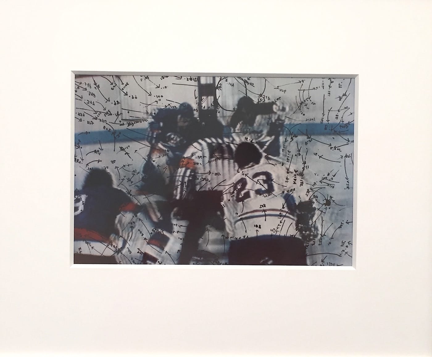 Garth Greenan Gallery is showing 12 prints by Howardena Pindell from her Video Drawings series (1974–76). They show stills from televised sports, which Pindell has superimposed with transparencies that she’s annotated with minuscule numbers and flying arrows. There is apparently no mathematical logic to her additions, though they vaguely correspond to the action depicted: boxing, a football game, lifting weights. Her cryptic marks are like an invented language that attempts to compute these athletes’ herculean movements. Pindell, who continues to make work and is currently a professor at SUNY Stony Brook, will be featured in the Brooklyn Museum’s upcoming exhibition, We Wanted a Revolution: Black Radical Women, 1965–85.