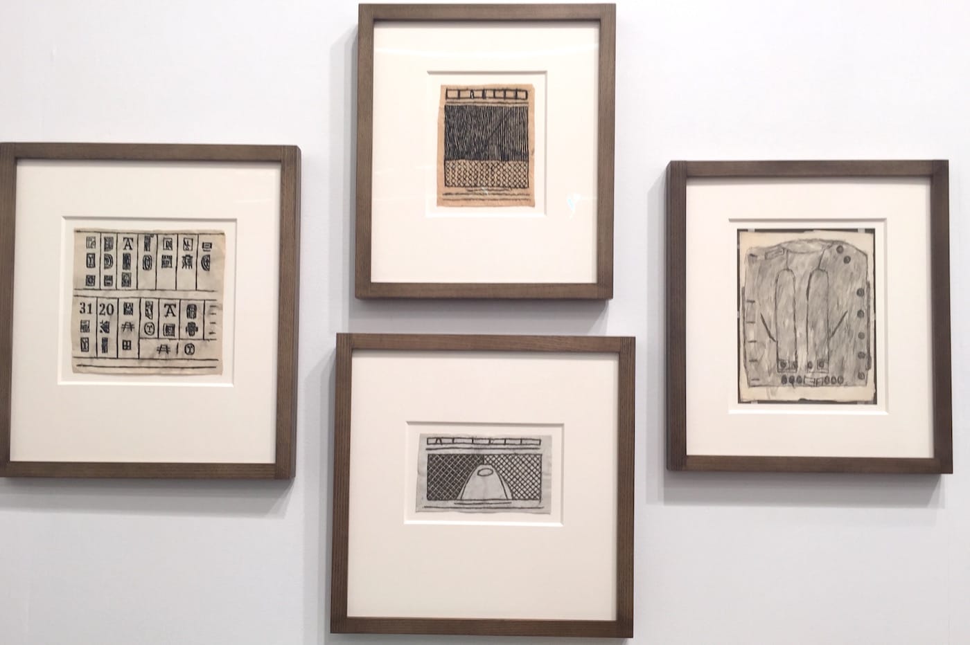 Next up, at Fleisher/Ollman Gallery, is James Castle, who, as one of the gallerists put it, is an “outsider artist, if you like to use that term.” Castle (1899–1977), who was profoundly deaf, drew prolifically throughout his life, though it wasn’t until the last 20 years of his life that his work gained prominence. His drawings of doorways, jackets, farmscapes, and horizons were often composed from unlikely materials: sticks, soot, spit, fruit pits, and other scraps he found in the trash, mixed in with watercolor and oil sticks.