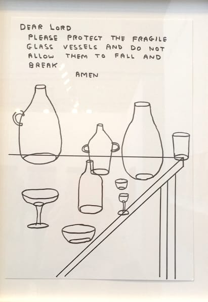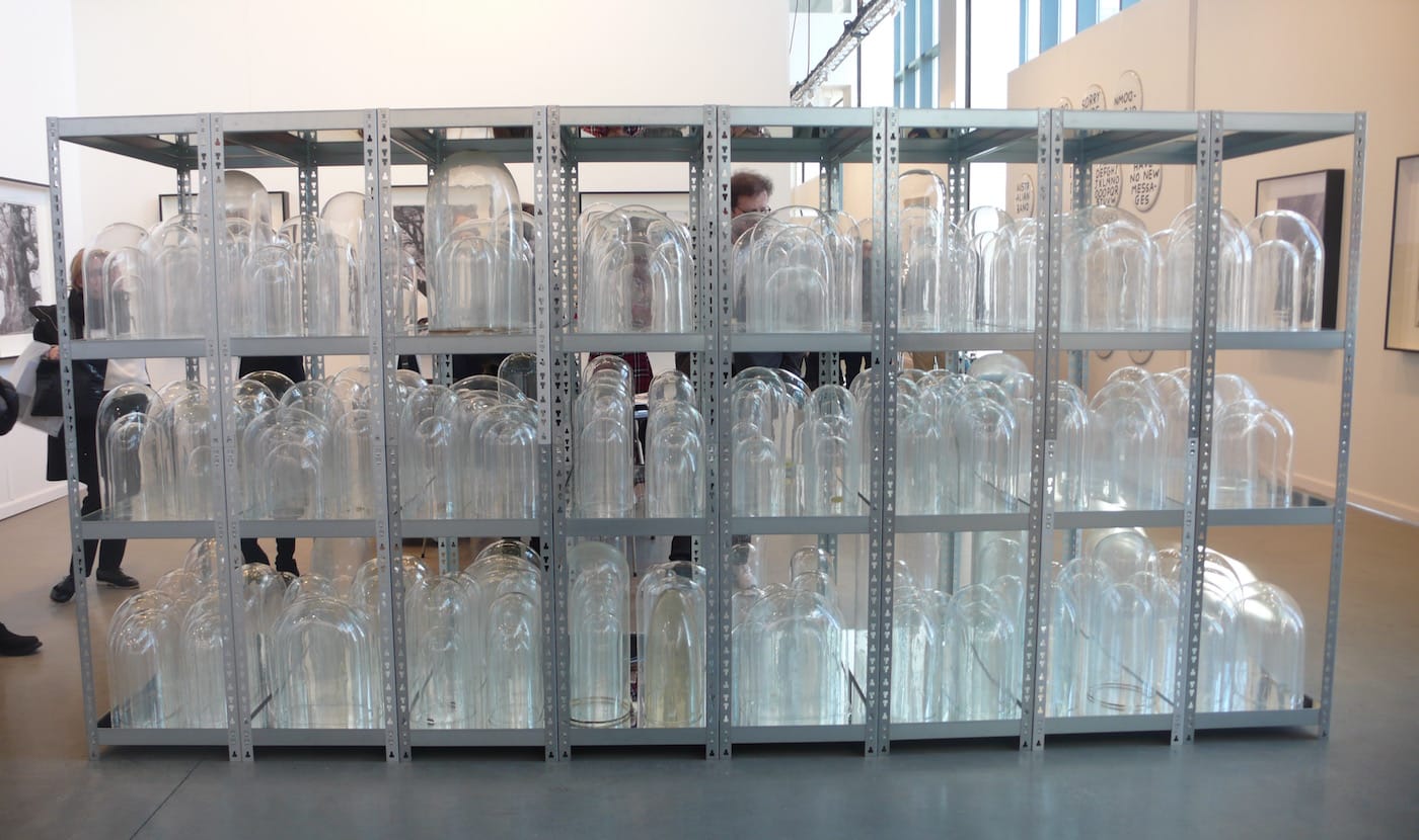 Echoing Shrigley’s plea to “Please protect the fragile glass vessels and do not allow them to fall and break … Amen,” artist Patrick Van Caeckenbergh has installed multiple racks of bell jars at Lehmann Maupin‘s booth nearby. Today, in Brooklyn at least, these delicate, hand-blown domes would probably be used to house terrariums, but the ones on view here were once used to shield saints’ relics from dust. Van Caeckenbergh, who is Belgian, purchased the jars from a Flanders man who collected them after they were discarded as the Flemish region became increasingly secular. The installation is one of the more poetic works of the fair, as these empty containers appear to conserve the void the ghostly saints left behind.
