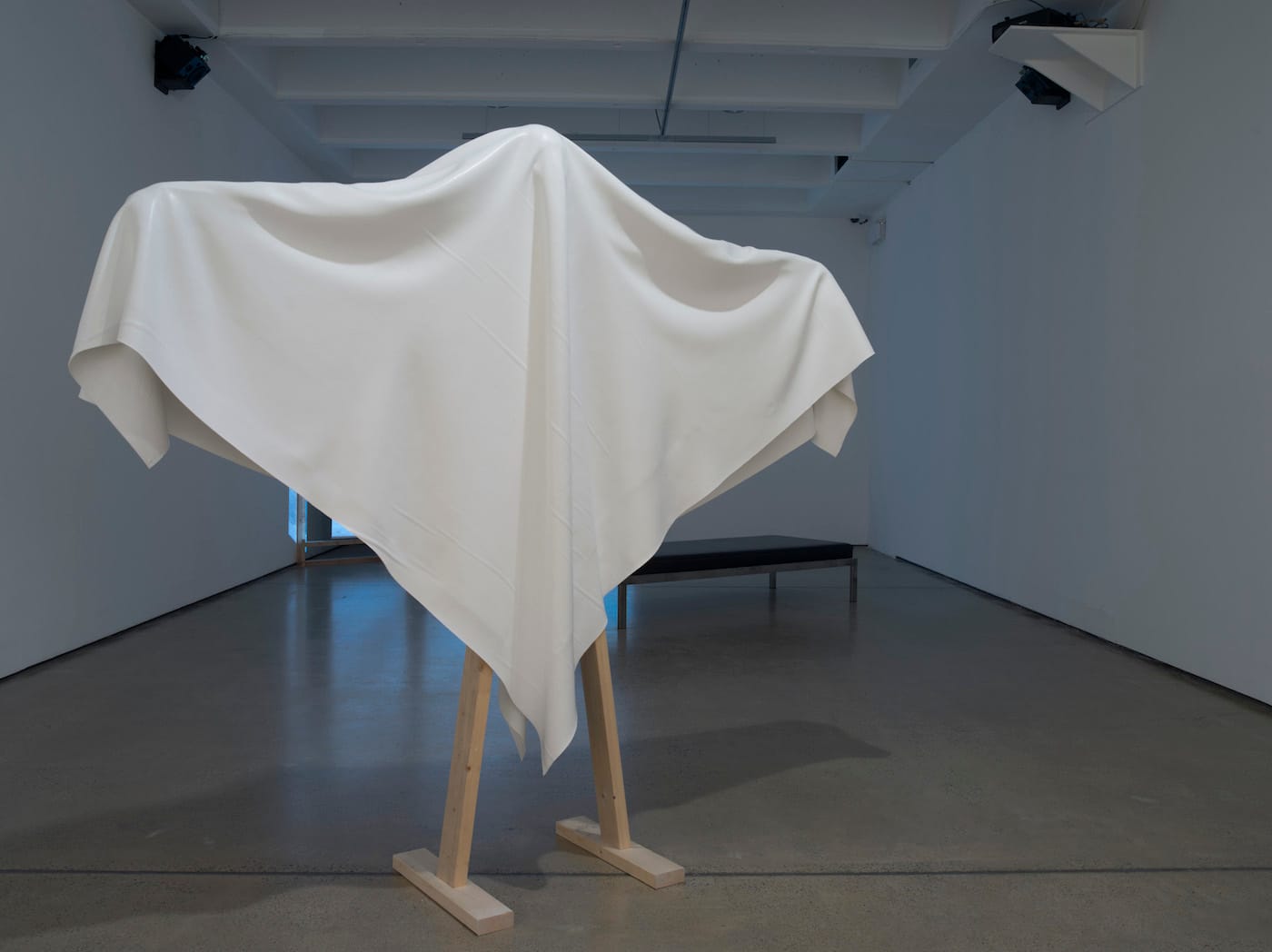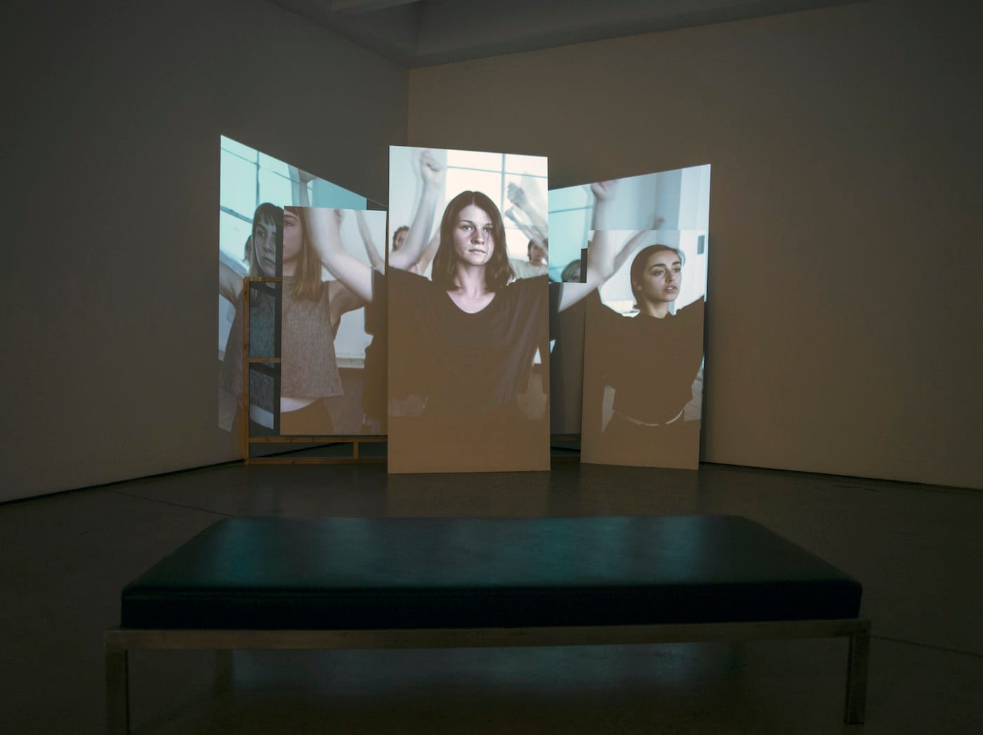 Elsewhere in the show, Archie Moore’s “Bogeyman” (2017) stands as an ominous presence. The “paint skin” (a build-up of acrylic paint) resembles a white sheet draped over a simple wooden structure, evoking the specter of first contact and racial stereotypes, speaking directly to racially motivated hate such as is found in Abu Ghraib and within the KKK. Behind Moore’s piece is “39 Steps” (2017), a single-channel video of women dancing to choreographed moves, taken at the Women’s March in Melbourne earlier this year. Artists Gabriella and Silvana Mangano project the video onto differently sized and shaped mirrors in order to emphasize how the body carries messages in public space. The women’s gestures explore the kinds of authority or inspiration that can happen when a march gets translated into a dance.