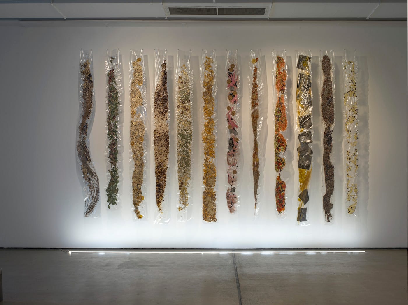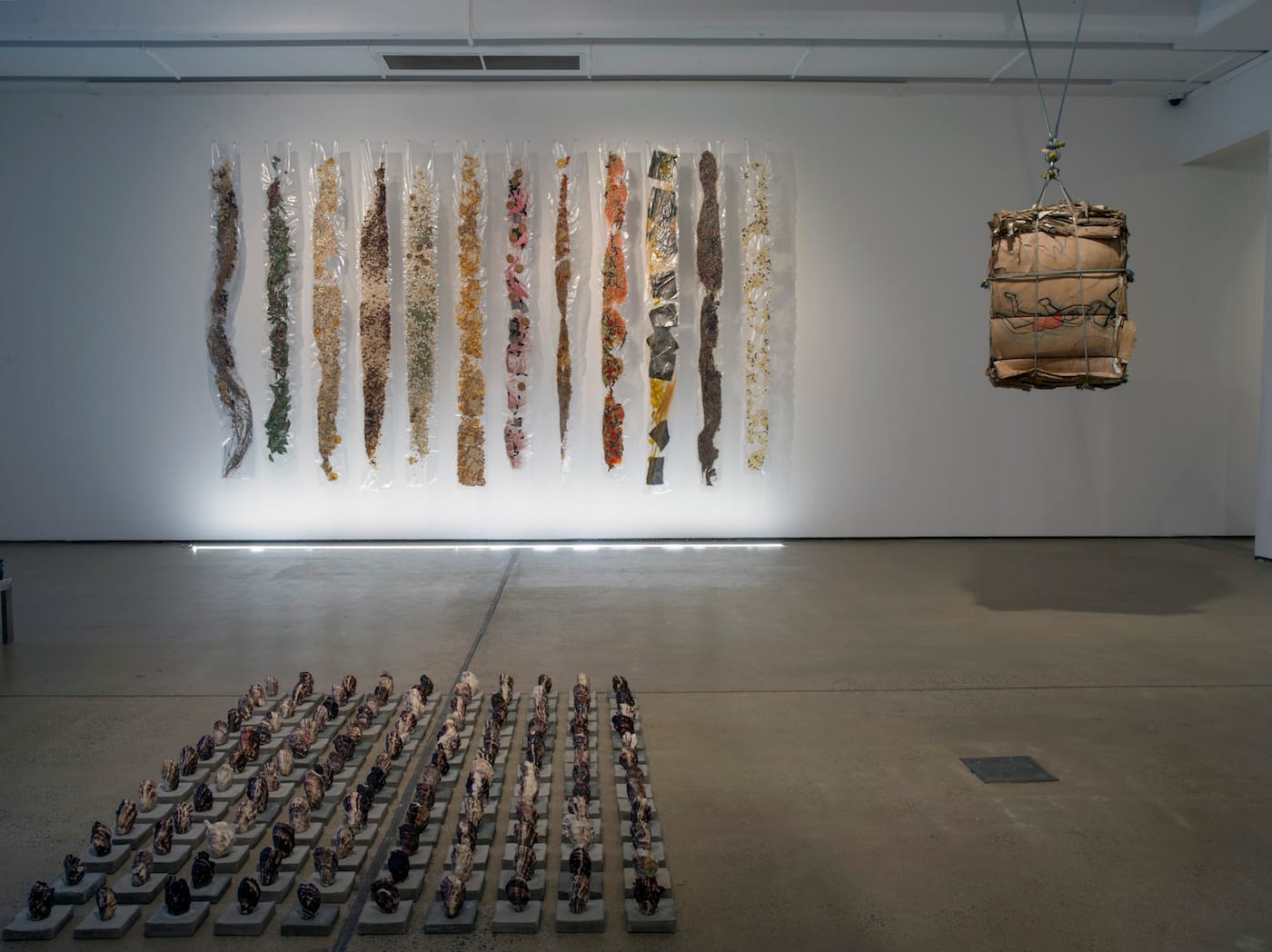 Keg de Souza’s “the earth afford them no food at all” (2017) is one of the larger pieces in the show. It consists of 12 vacuum-packed plastic bags hanging in vertical rows across the gallery wall, each filled with different native spices and other processed food popular in Australia — 55 foods in total. These simple, quotidian materials reflect how national identity is formed through food culture, and the hermetically sealed bags reference Australia’s strict food biosecurity laws.
