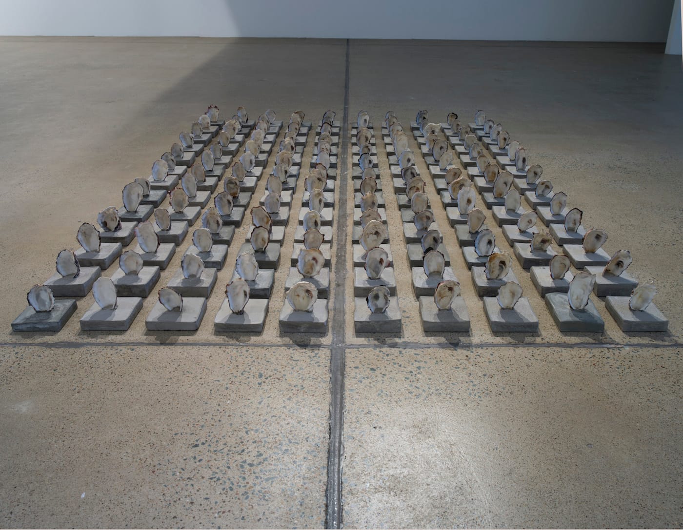 In “Foundations II” (2017) by Quandamooka artist Megan Cope from North Stradbroke Island (Minjerribah), oyster shells are mounted on cast concrete and arranged in a 10×10 grid on the gallery floor. Traditionally, oyster shells are used to make middens — mounds of discarded refuse that mark human settlements for many First Nation groups. The concrete references the drudging and sand mining on Stradbroke Island that has led to the removal of many of these middens, but here, each shell stands upright on its cement block as if in defiance. These materials represent the destruction of significant heritage site and express the politics of extraction and displacement. Cope subverts this common modernist aesthetic (the grid) by using it to project colonial violence on the landscape.