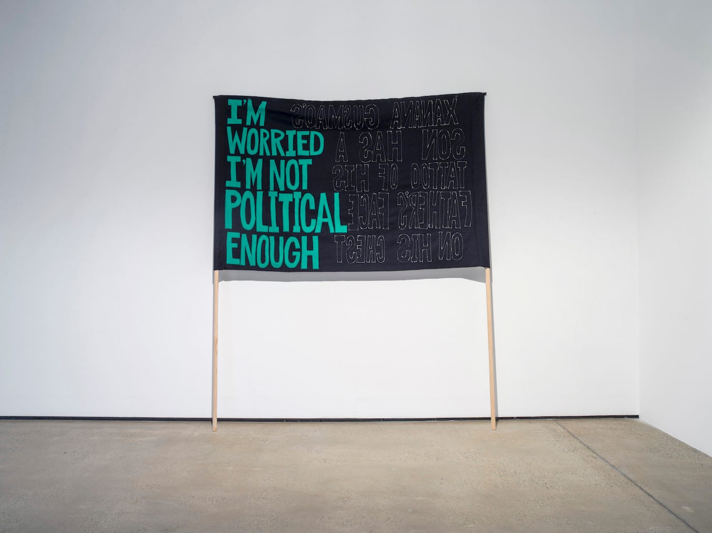 Raquel Ormell’s “I’m worried this will become a slogan” (1999–2009) is a collection of double-sided banners made of wool and felt with inscriptions such as “I’m worried I’m not political enough” on one side and a related news headline on the other. The slogans reveal the artist’s anxiety and perceived lack of agency when it comes to conveying political messages through her art. Her work remains prescient, considering the angst-ridden political landscape we all must traverse these days. Jemima Wyman and Zach Blas’s four-channel video installation “I’m here to learn so :))))))” (2017) features Tay, Microsoft’s AI chatbot that existed for only one day. The artists bring Tay back to life in Google DeepDream–scape and then take viewers on a deeply disturbing journey through the politics of pattern misrecognition, dangerous algorithms, and biometrics.