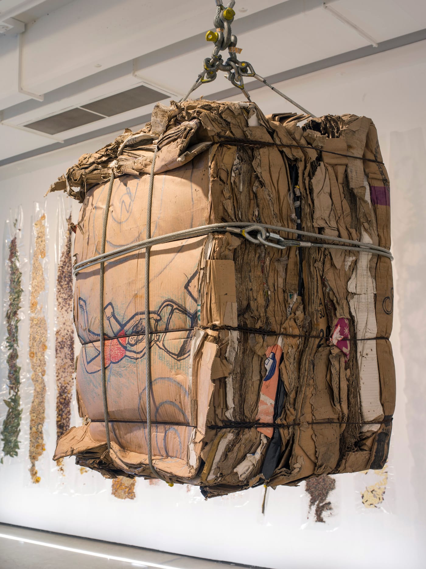 Tintin Wulia’s “172 Kilograms of Homes for Ate Manang” (2017) hangs from the wall off to the side, between Cope’s bags and de Souza’s grids. Her bale of cardboard is wrapped so tightly with wire that it seems to pull in the space around it. Some simple drawings in red appear on the side of the bale, which Wulia purchased from an informal network of recyclers who collect cardboard refuse from the streets of Hong Kong, consolidate it, and then sell it off to be recycled in China. The project took an unexpected turn when she traced the cardboard’s movement and discovered a micro economy: The collectors often lease the discarded cardboard to Filipino domestic workers to be used to make temporary shelters. This large population of workers generally has no space of their own, so they construct living rooms in public spaces during their days off. For Wulia, these makeshift rooms became sites in which to record stories and build relationships. During her time with the domestic workers, they made drawings on the cardboard, which helped her locate the pieces once they started to circulate again, and she used these to construct the bale hanging in the gallery.