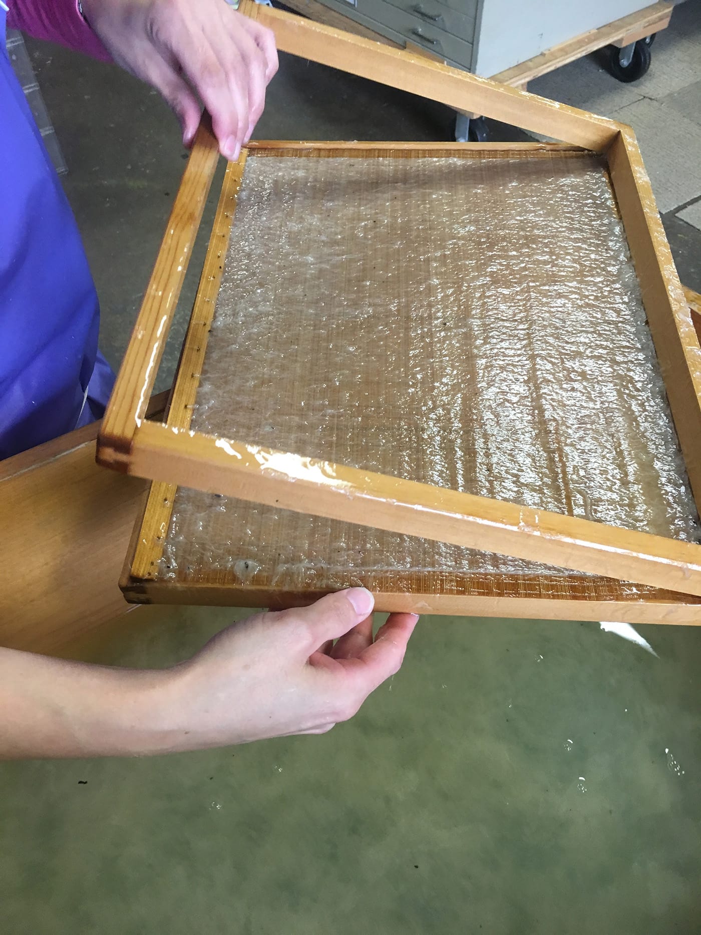 At the Morgan I was first introduced to kozo through my nose. Paper artist-in-residence Hong Hong sat quietly amongst the flurry of a touring crowd as she stirred a pot of kozo whose aroma recalled the sweet aroma of a maple sugar shack. She had recently harvested the kozo from the grove, and was processing the fibers to create beautiful large-scale paper pours characterized by her painterly, colorfully-saturated, abstract expressionist style. In an email interview, Hong described how the garden attracted her to the Morgan: “The idea of a secret kozo garden, tucked away in the Rust Belt, had this legendary ring to it. I immediately knew that I wanted to make paper there.”