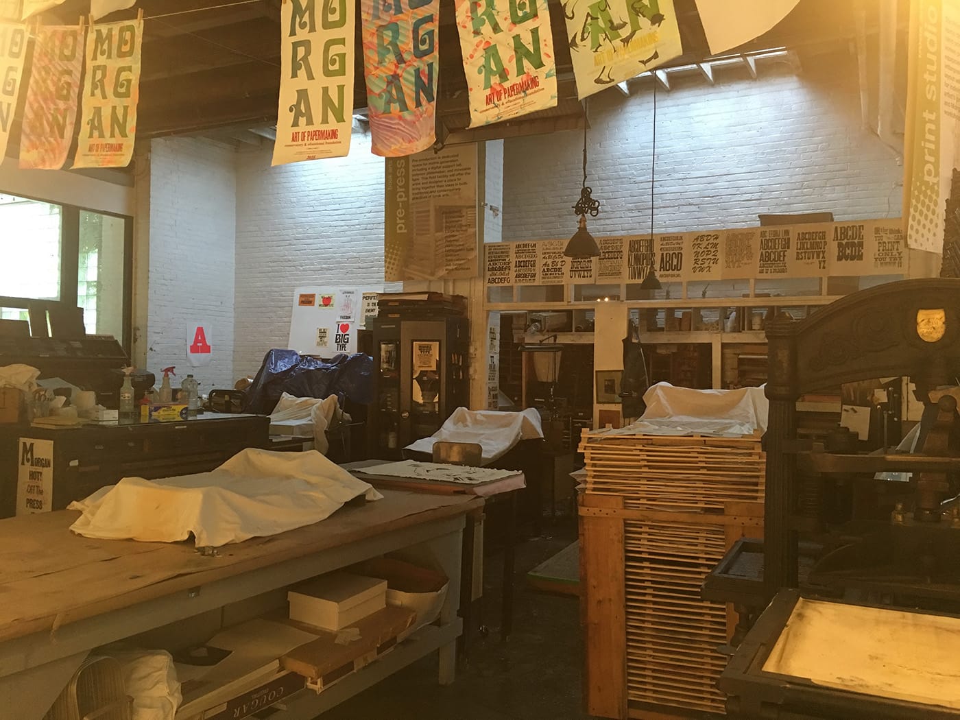 There’s a comprehensive bindery that takes one through every stage of the book making process, and a print studio with the capacity to support print production for individual and collaborative artist’s projects, books and workshops, and a dedication to hand printed intaglio, relief, and screen prints, with letterpress production. (The presses are special enough to warrant attention from local historians, and the Conservatory can provide ample details of their provenance.) The studios are neat, tidy, and bright with open sunlit rooms making for a welcoming space. Throughout the studios are displays of the Morgan’s connection to the community found in the form of details like hand-printed posters, upcycled movie theater doors as studio doors, and a cabinet filled with a donated collection of antique watermarks.