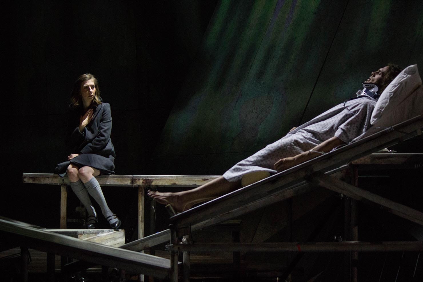 The live action commenced the moment the audience entered, with onstage events never missing a beat, even throughout intermission. There was full frontal female and male nudity, simulated hand jobs, and copulation interspersed with heart-wrenching, deluded self-sacrifice mixed with stern Calvinistic morality tinged by imagined conversations with God. The main character Bess McNeill, acted by Kiera Duffy, was a part that could have steamrolled a singer of lesser stamina — Duffy played naïve, coy, confused, in love, mutilated, and finally dead in various states of dress and undress. The same goes for the male lead, her husband Jan Nyman, or “Jan from the (oil) rig,” played by John Moore. His most substantial arias were delivered in a neck brace lying prone atop a wooden board.