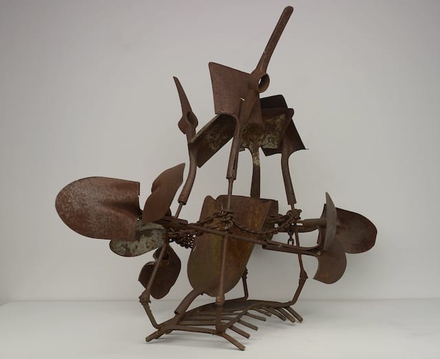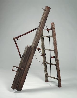 Among them: Cubist-style fragmentation of form; constructing sculpture from assembled parts, as opposed to extracting it from lumps of raw materials; appropriating and reassigning meanings to (“recontextualizing”) found objects; creating “paintings” as sculptural objects; and what postmodernists might call the “strategy” of representing complex, abstract themes through sophisticated symbol systems.