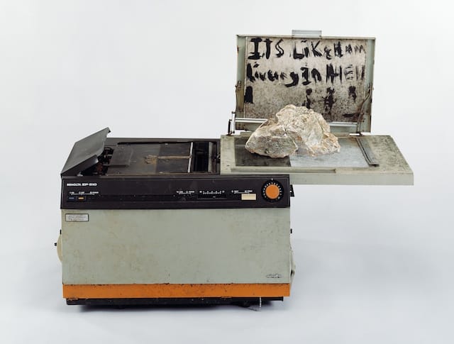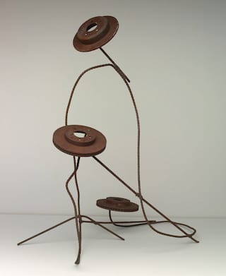 Lonnie Holley’s ingenious way of bringing together disparate objects or materials — a rock with a photocopier; wooden crutches with the side of a baby’s crib; scraps of rusty wire and old wood — and, even more magically, of combining their spirits, gives his creations a talismanic quality that leaves Marcel Duchamp’s appropriationist exercises cold. The aura of Holley’s concoctions is probably what the surrealists were aiming for; what he conjures up is more naturally, unaffectedly intense.