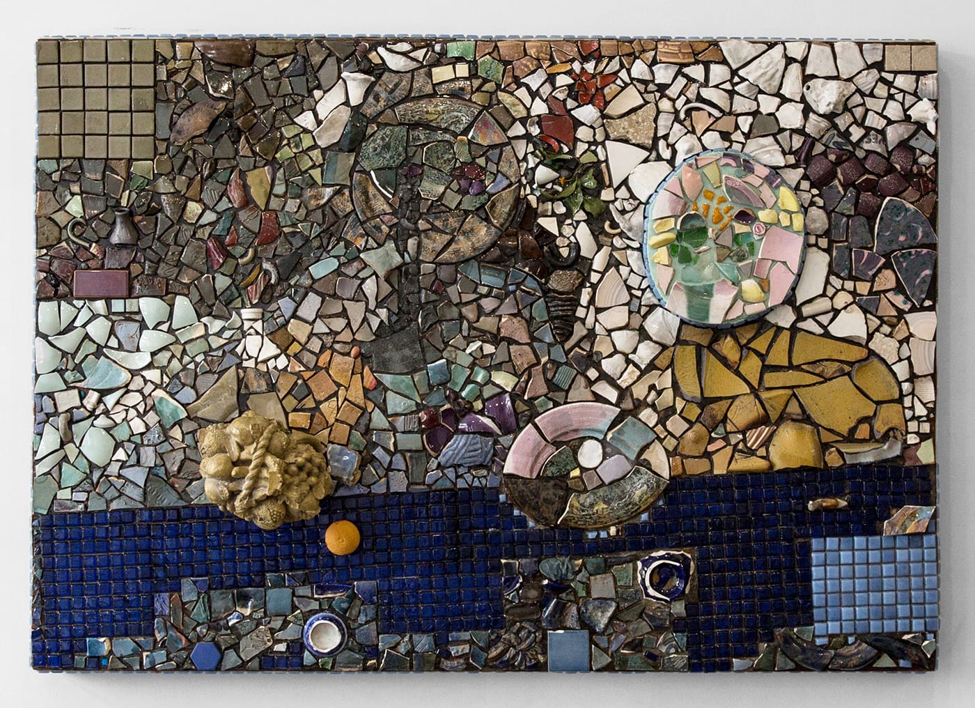 Virignia Rose Torrence’s mosaics are constructed entirely from found objects, principally the content of several bins of hoarded ceramic shards saved over the course of three decades by an adjunct ceramics professor at Marygrove College, where Crissman just finished his term as a professor (due to the closure of the undergraduate program).