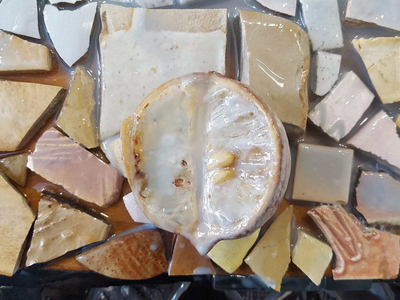 “I’m encapsulating all those materials under one skin of plastic — and that’s a really satisfying action, to stop the decay of something, and try to unify them and bring them all into the same space,” said Torrence. The image of a once-living fruit incorporated into a tile mosaic is jarring and, just as the symbology of Dutch still life presented notions of desire and memento mori, these ceramics subtly struggle with the ultimate futility of art to stop time, try as it might.