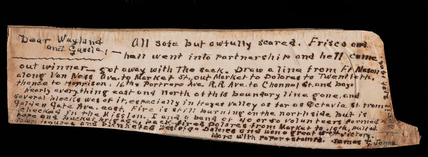 The Gold Rush started in 1848 and just two years later, California became a state. People coming from around the country and world to make their fortunes dramatically changed the region, and California became nationally prominent. Less than 60 years later, an earthquake devastated much of San Francisco, the state’s largest city at the time. The California Historical Society show displays a letter a man wrote to his family about the devastation. Since stationary was in short supply, he wrote on what was at hand — in this case, a shirt collar.