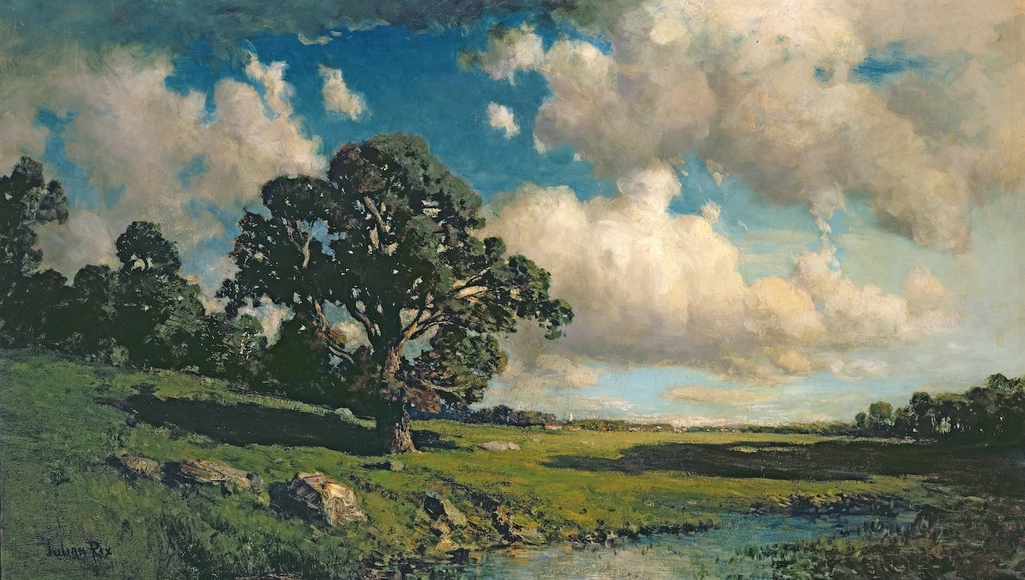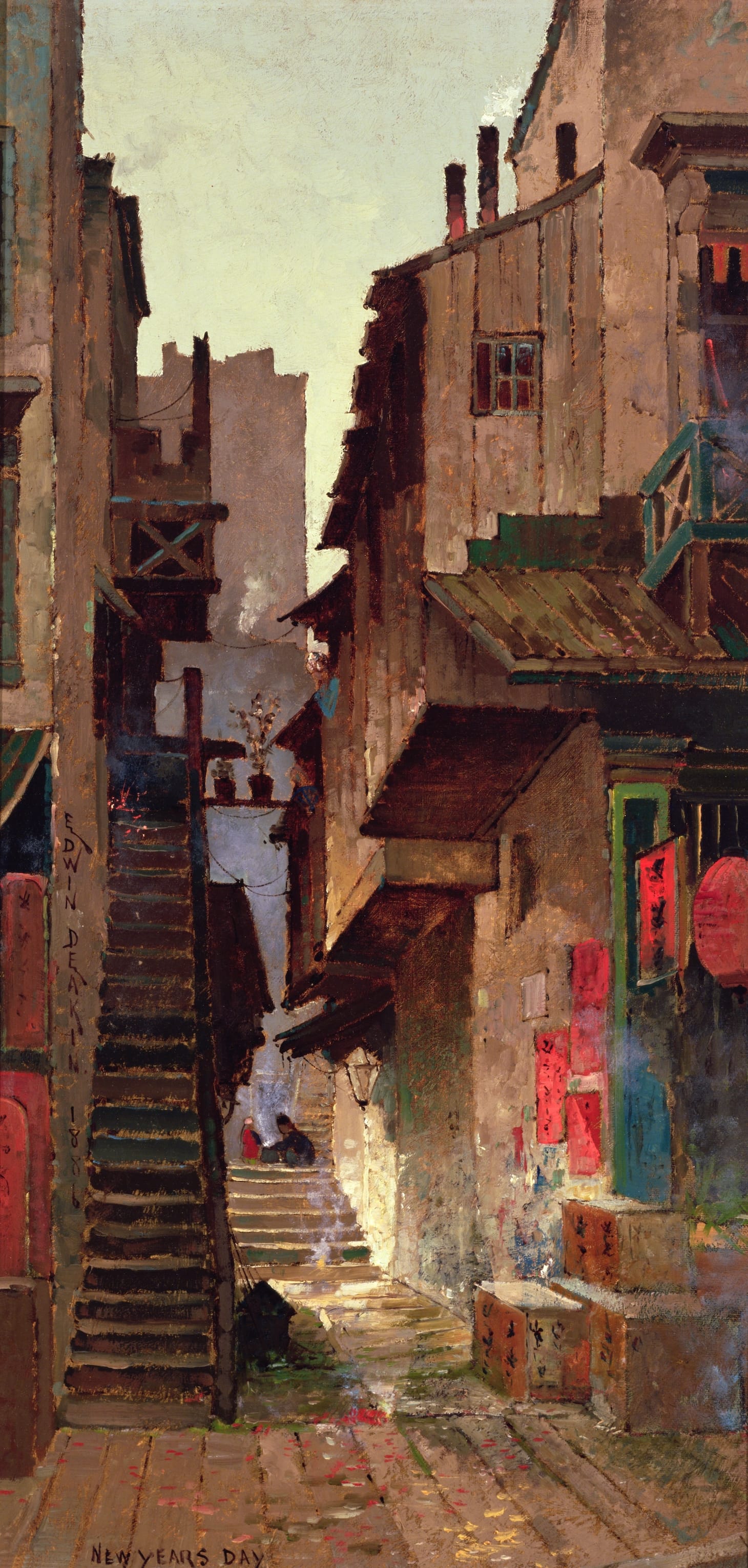 With the Chinese Exclusion Act of 1882, white people started to see Chinatown as less threatening, Garcia says, and painters became interested in the neighborhood as a subject. One of the paintings in the show, “New Year’s Day, St. Louis Alley” (1886) by Edwin Deakin, is on an elongated canvas, and he signed the work vertically to mimic Chinese painting.