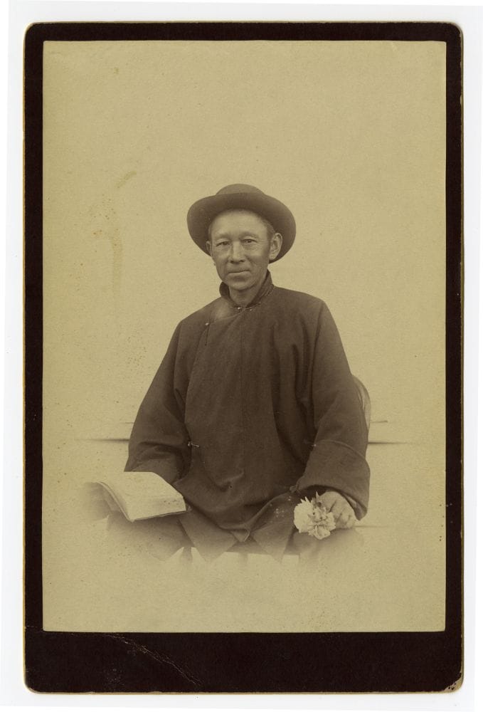 The case has some Chinese-language newspapers, including The Golden Hills’ News, and portrait studio photos where Chinese people chose how they wanted to portray themselves. One photo shows a man holding a book and a flower, and another a woman with a fan.