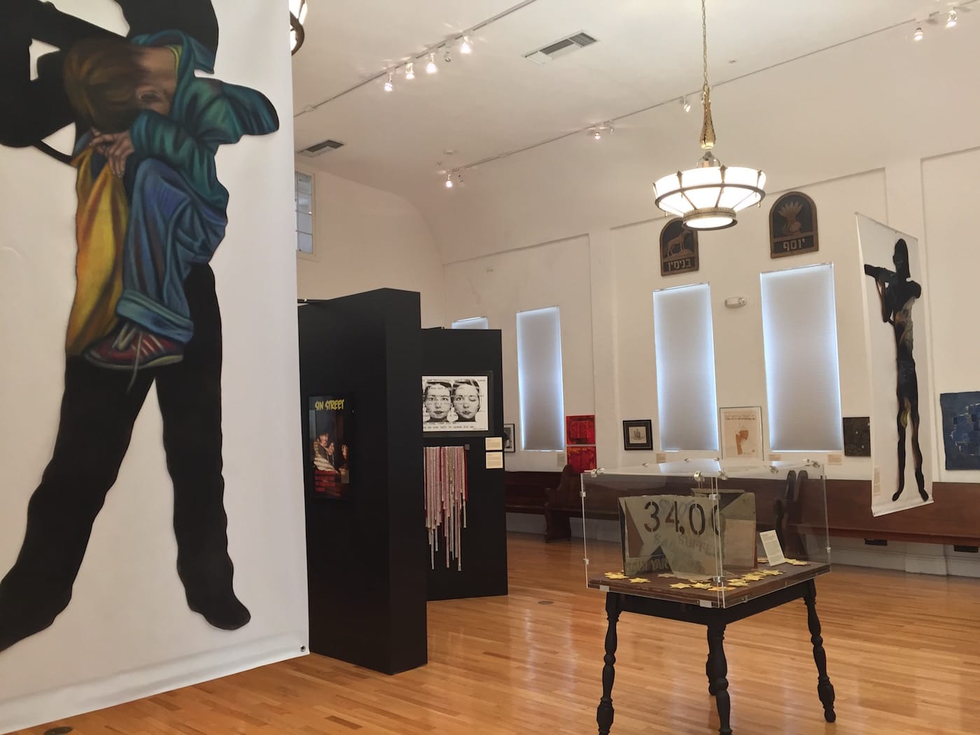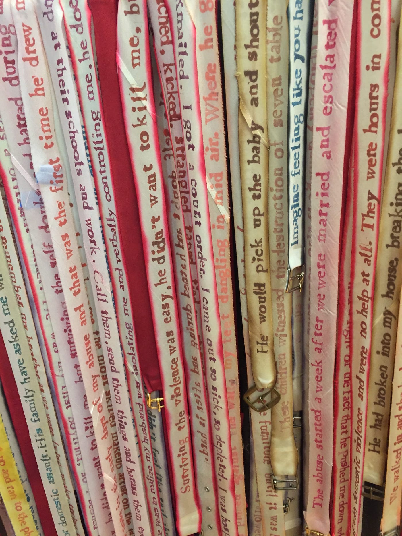 Women are common victims in Evil. Steps away from the KKK robe is a cluster of delicate silk belts by Andi Arnovitz, each stamped with quotes by women who’ve suffered domestic abuse. Titled “Beaten out of Them,” they come in an array of colors. The red belts feature quotes by women who are no longer alive. One reads, “surviving the violence was easy, he didn’t want to kill me,” which is unsurprising enough to still be nausea-inducing.