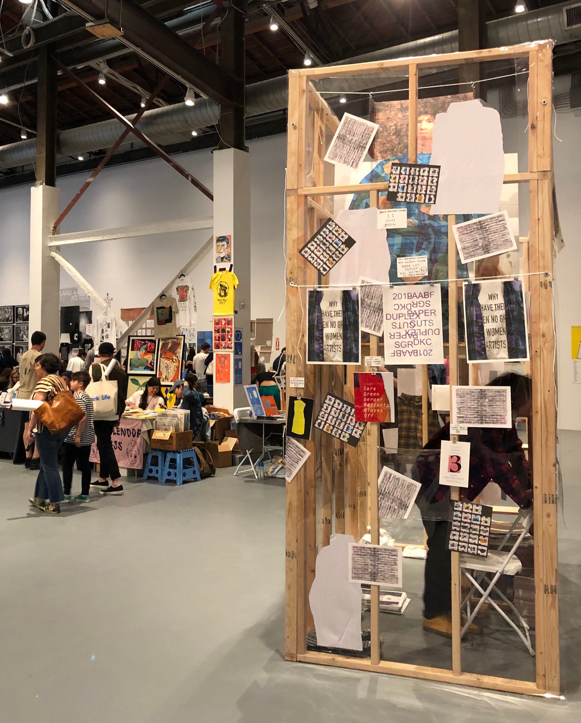 Nearby, the Corita Art Center has mounted a small exhibition of the late artist and activist Corita Kent’s silkscreen prints and photographs, a nice segue into the adjacent Friendly Fire section of the fair that features small press editions focused on political and cultural activism. There, Paper Cuts, a collaboration between artists Sara Greenberger Rafferty and David Kennedy Cutler, has built a free-standing structure that doubles as exhibition space and vendor booth.