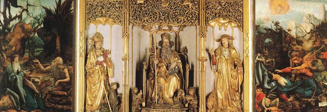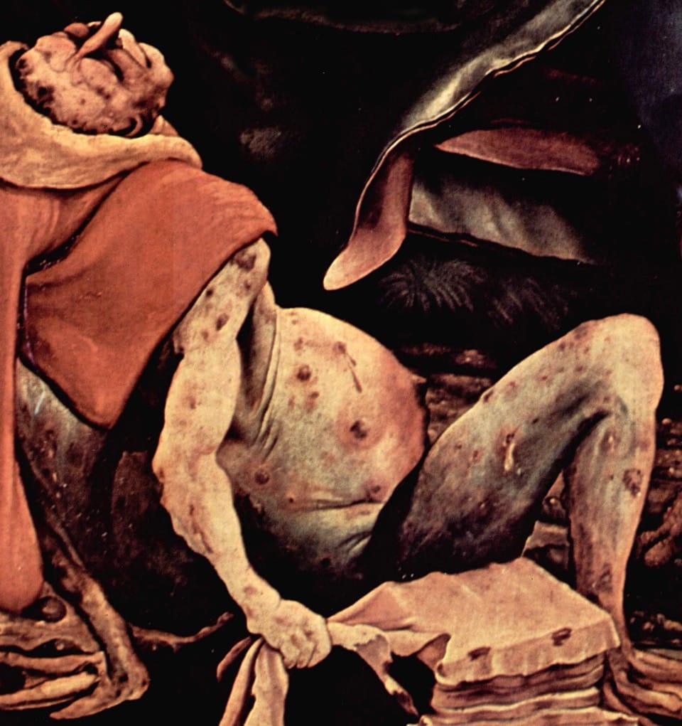 That Alsace region is where Mathias Grünewald’s masterpiece oil-on-wood polyptych painting “Isenheim Altarpiece” (circa 1516) is located, at the Musée d’Unterlinden in Colmar. The painting is pertinent to the coronavirus era because it teems with high-pitched, electrifying emotion that blends ecstasy with agony. A transcendent, visionary impulse comingles here with dark, macabre fatality, grounded in plague time, since the painting contains references to the Saint Anthony’s fire epidemic (aka ergotism). Grünewald created it for the St. Anthony Monks (who treated the epidemic with plant-extracted, tranquilizing balms) to be placed in their Hospital Monastery in Isenheim; intended for those praying to Saint Anthony the Hermit to help them avoid contracting the disease caused by excessive intake of ergot fungi. Besides the suspended, crucified, pockmarked body of Christ in the first panel that is visually reminiscent of the AIDS viral epidemic — on the surface of the body advanced AIDS can manifest as herpes simplex, herpes zoster (shingles), skin rashes, warts and ringworm — there is a fallen victim of the ergot epidemic horrifically depicted in the third panel.