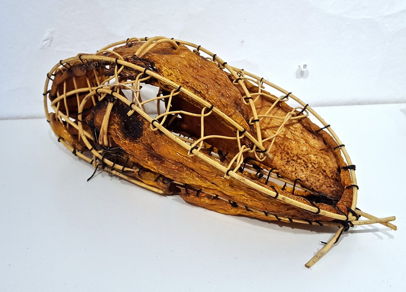 There is something evocative and primitive about Eddy’s little constructions, forming shapes and configurations that seem at once esoteric and fundamental. The collection of objects looks like the tools for an unknown ritual — some hanging like dreamcatchers, some freestanding like animal skulls — and fall along a continuum between mostly skin and mostly reed. The biodegradable aspect of Eddy’s materials reveals patterns of decay, shriveling, and mummification. If one were to enter a forest glade strewn with these objects, one might fairly assume they were about to get Blair Witch’d.