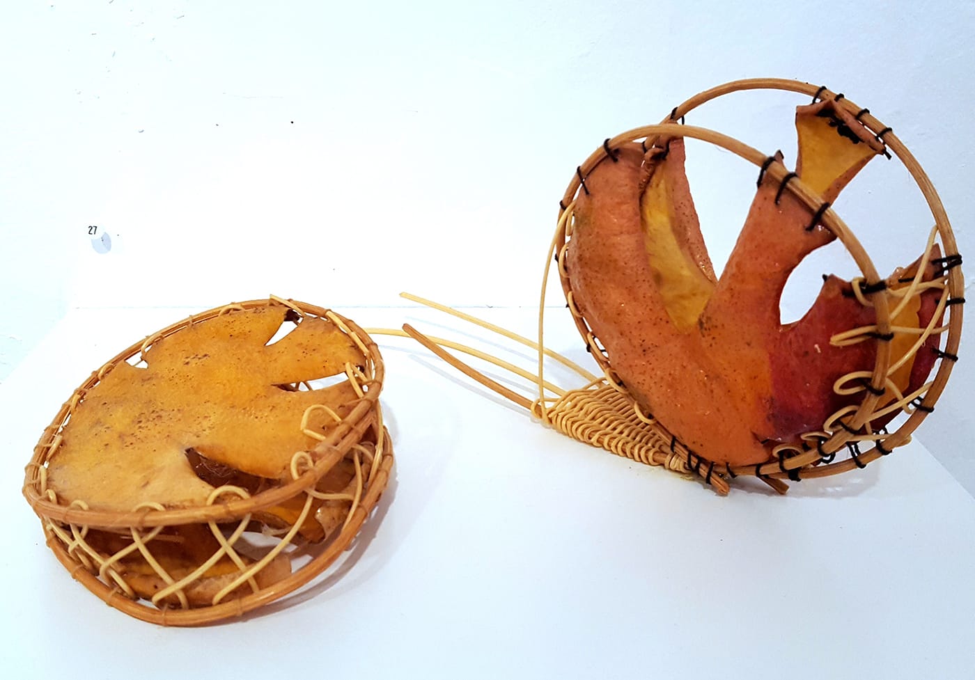 Eddy describes these forms as “vessels of choice” — just as women have an option, rather than an obligation, to reproduce, these fruits take on different objectives other than the reproduction of their own forms. One might say they are the liberated vessels: fruit as woman as artist. No wonder they have a bit of a witchy feel to them. While most of Eddy’s works are titled simply with the PLU number provided by the grocery store, one work, titled “Not a Baby Basket,” rendered in reed and painted in menstrual blood, exemplifies this metaphor of the baskets as liberated women.