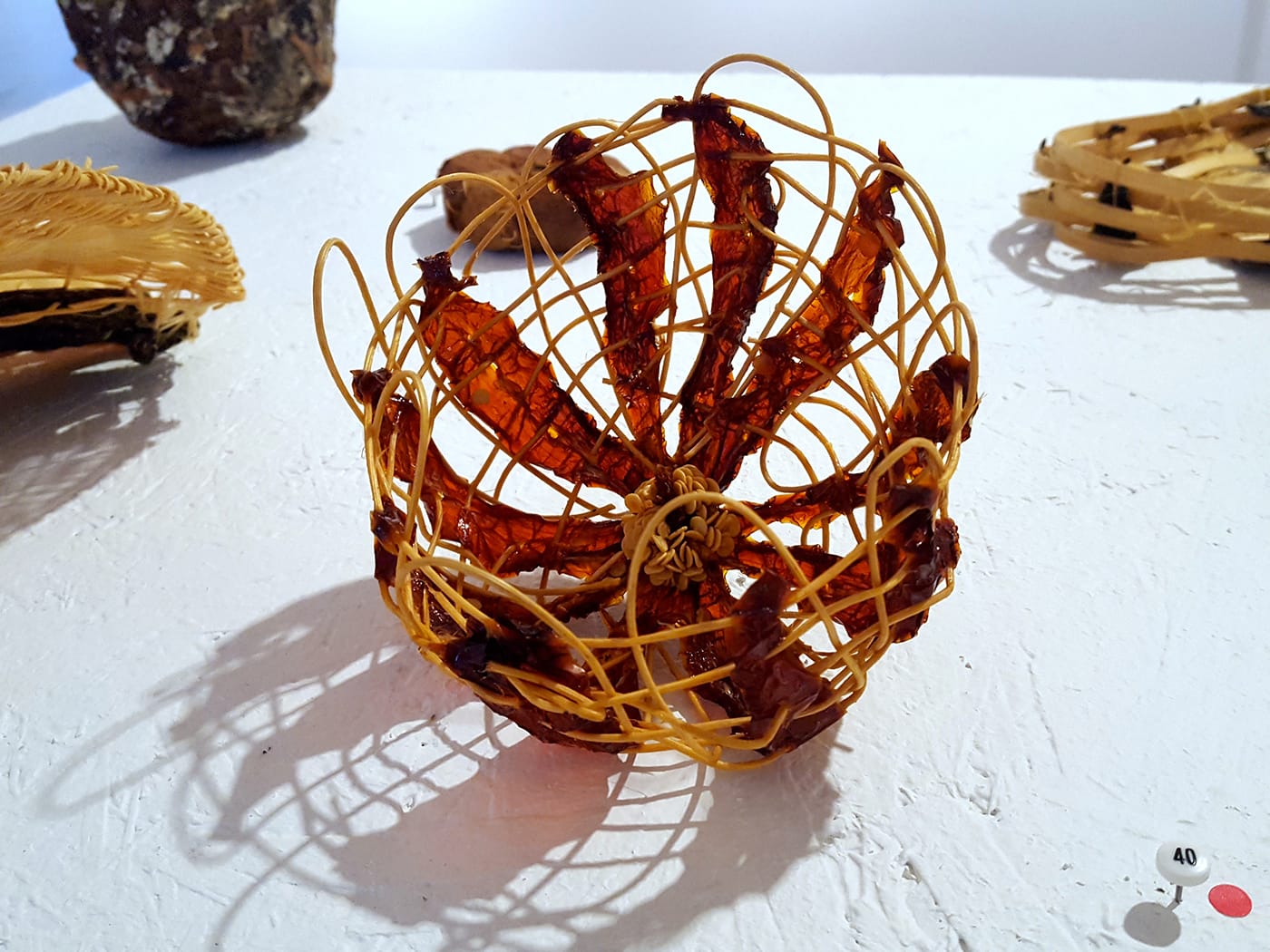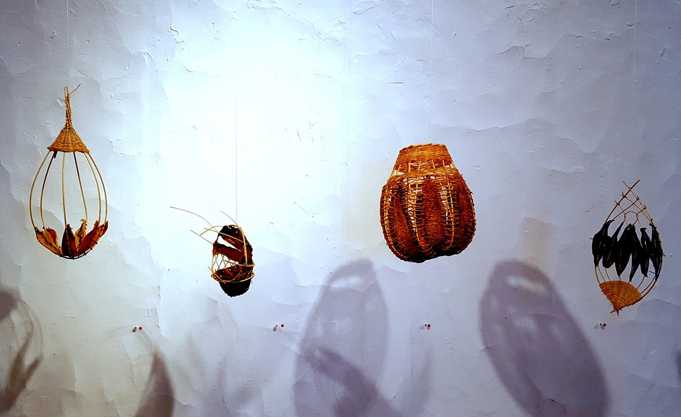 Joining work in diverse media by artists Alyssa Bogdan, Ginny Martin, and Manal Shoukair, Eddy’s contributions stand out in part by sheer numbers — of 58 pieces on display in the Scarab Club’s main gallery space, 46 were produced by Eddy — but also in their direct use of the fruit as a living material, rather than just casting it. In a relatively tight span of two months, Eddy cultivated an experimental and hands-on process of converting fruits from Chile, Guatemala, and Mexico into 2D painted works, with pigments developed from the juice of the various fruits, and 3D sculptural works that use basket-woven reed constructions as the superstructure for intricately cut and dried fruit skins.