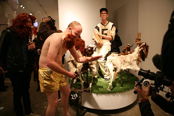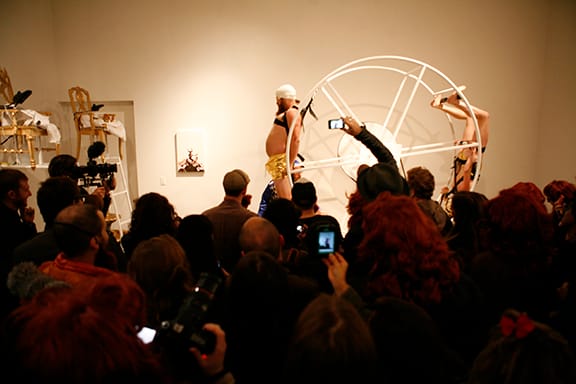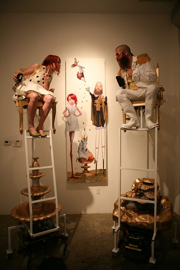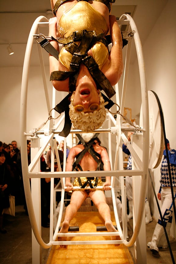 This past summer, they were champions (triumphing over the likes of Tom Sachs and Dustin Yellin) in Creative Time’s Sand Castle Building Competition, with their life-sized, live-action human (with real spitting) sandcastle fountain. So, what are they up to now? This weekend at Allegra LaViola Gallery on the Lower East Side they will be scantily clad, strapped to a giant wheel, and repeatedly dipped in a vat of liquid gold. Of course!