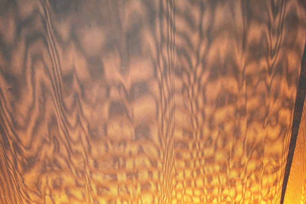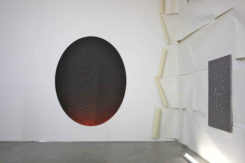“Untitled (Moire)” (2011) is like the thumping-bass porn soundtrack version of a Robert Irwin scrim. Instead of a rectangle, a vertical oval is cut into the surface of Boesky’s wall with a dip behind it. Inside the silhouette shape are installed two orange fluorescent lights. Masking the opening of the hole into the gallery is a shimmering black curtain: the “moire” of the title refers to the eye-watering op-art effects of offset lines intersecting, like an off-frequency old TV display. The weave of the curtain deflects the fluorescent light in a dizzying, sexy way that alters with every movement; instead of the silent purity of visual experience that characterizes an Irwin, there’s something dirty and sweaty about that shimmering orange surface.