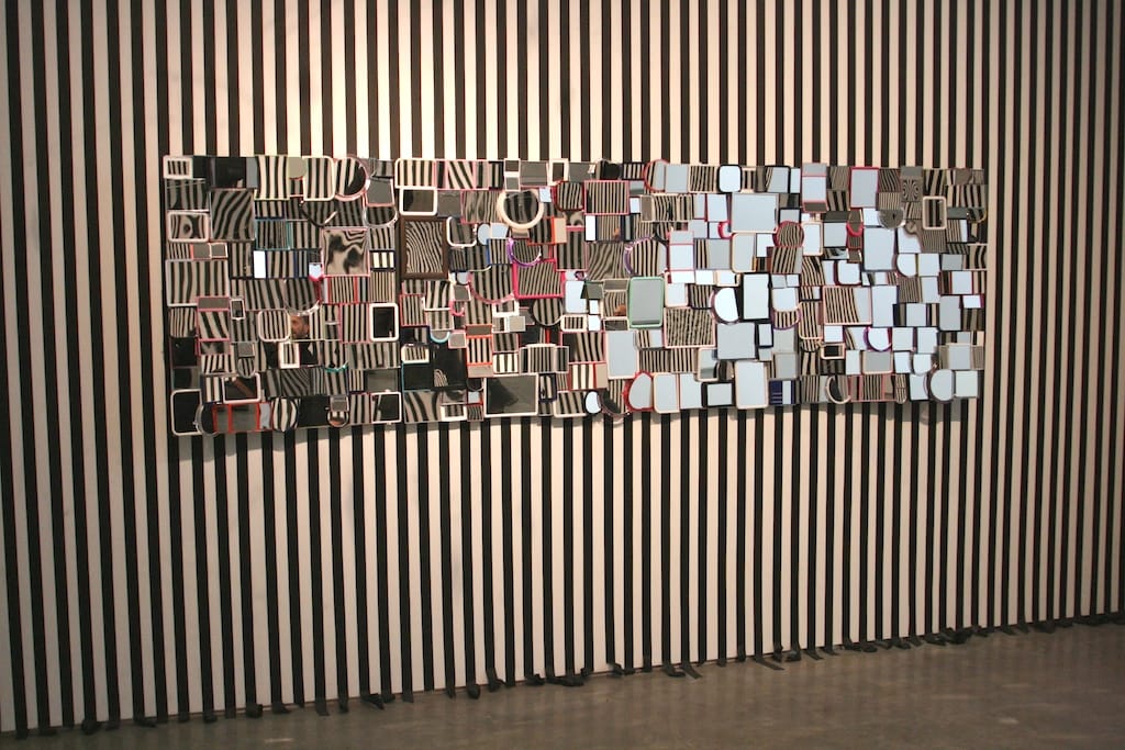 The nightclub vibe continues with Higashionna’s “Untitled (Mirror Assemblage)”, a dazzling surface of mirrors installed on another striped wall. An overwhelming collection of makeup compacts and small mirrors come together into a disco ball stretched out into a rectangle shape. Upon approach, I was refracted into a hundred different images. The artist’s op-art fetish totally comes through in the disorienting experience. In another work, Higashionna strings up black tape in a looping pattern that recalls a piercing corset (link NSFW). The piece is installed against another sloppily striped wall, this time by rolls of white paper that look like newsprint and lit by a fluorescent light placed on the floor. It’s a kinky Agnes Martin. Minimalist materials and visual vocabulary gone S+M? Sign me up.