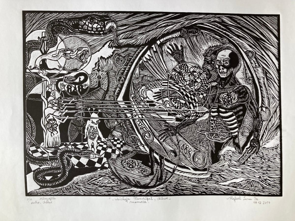 Lara's own lithographic works, which hang proudly on twine and clothespins in the studio along with his students' creations, depict rolling waves, botanical patterns, various creatures, and personal symbols, all rendered in a seemingly infinite number of minute strokes. "Weichafe" (2019), a lithograph he created as an album cover for the local band Wichañe, was inspired by the 19th-century Chilote pirate warrior Pedro María Ñancúpel, remembered by some as a vigilante who fought for Indigenous rights.