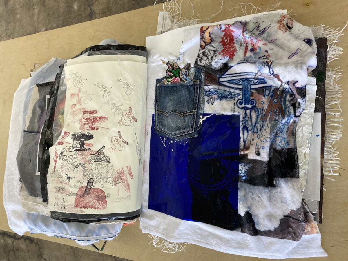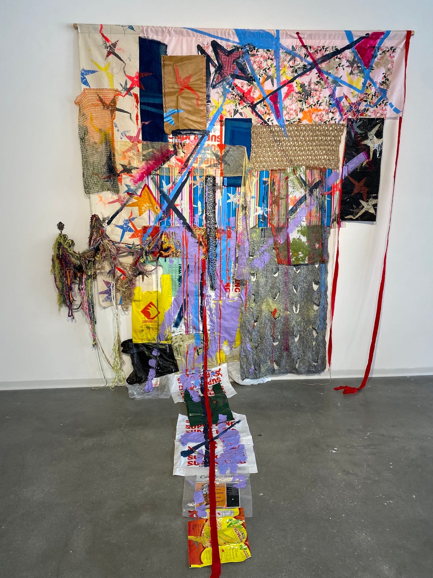 Diane Williams’s thesis show emerged from her research into the origins of the parol, a star-shaped Christmas lantern from the Philippines. The resulting woven and collaged textile works capture the challenges in tracking down its provenance through the Philippines’s tangled colonial history, and the unstable concept of authenticity. Incorporating patterned swatches of vibrant fabric from her mother’s dresses, food packaging from Philippine snacks, plastic bags, and even small Santo Niño dolls, the assemblages bust out of their frames and spill onto the floor, resisting neatly defined borders. Silkscreened images of stars reappear atop the riotous combinations, an ever-elusive cypher.