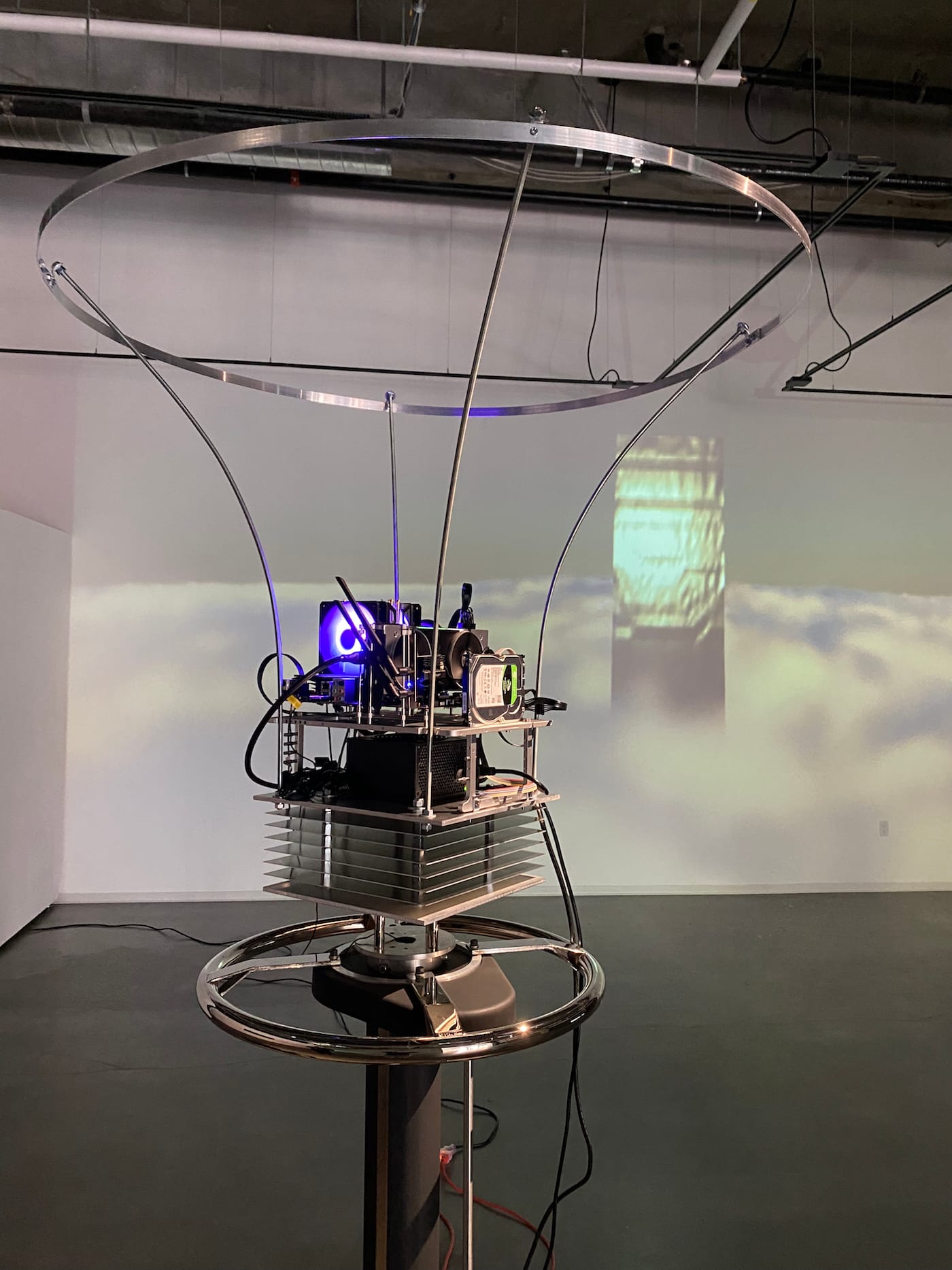 The centerpiece of Hings Lim’s show is an interactive projection of a CGI monolith poking through the clouds. The shape responds to sound, becoming a quivering mass before collapsing as the visitors talk or shout, an enigmatic but playful interpretation of our relationship to authority. The computer running the simulation sits on an imposing sentinel-like pedestal, an analog foil for the digital tower. Other works in the show probe history, ritual, and what it means to be human through a deft mix of media, from candles cast from prehistoric stone tools to a ghostly projection of an early hominid skull floating behind a set of colonial-era doors, a reflection on Lims's native Malaysia, once a British colony, and his own identity as a Malaysian of Chinese descent.