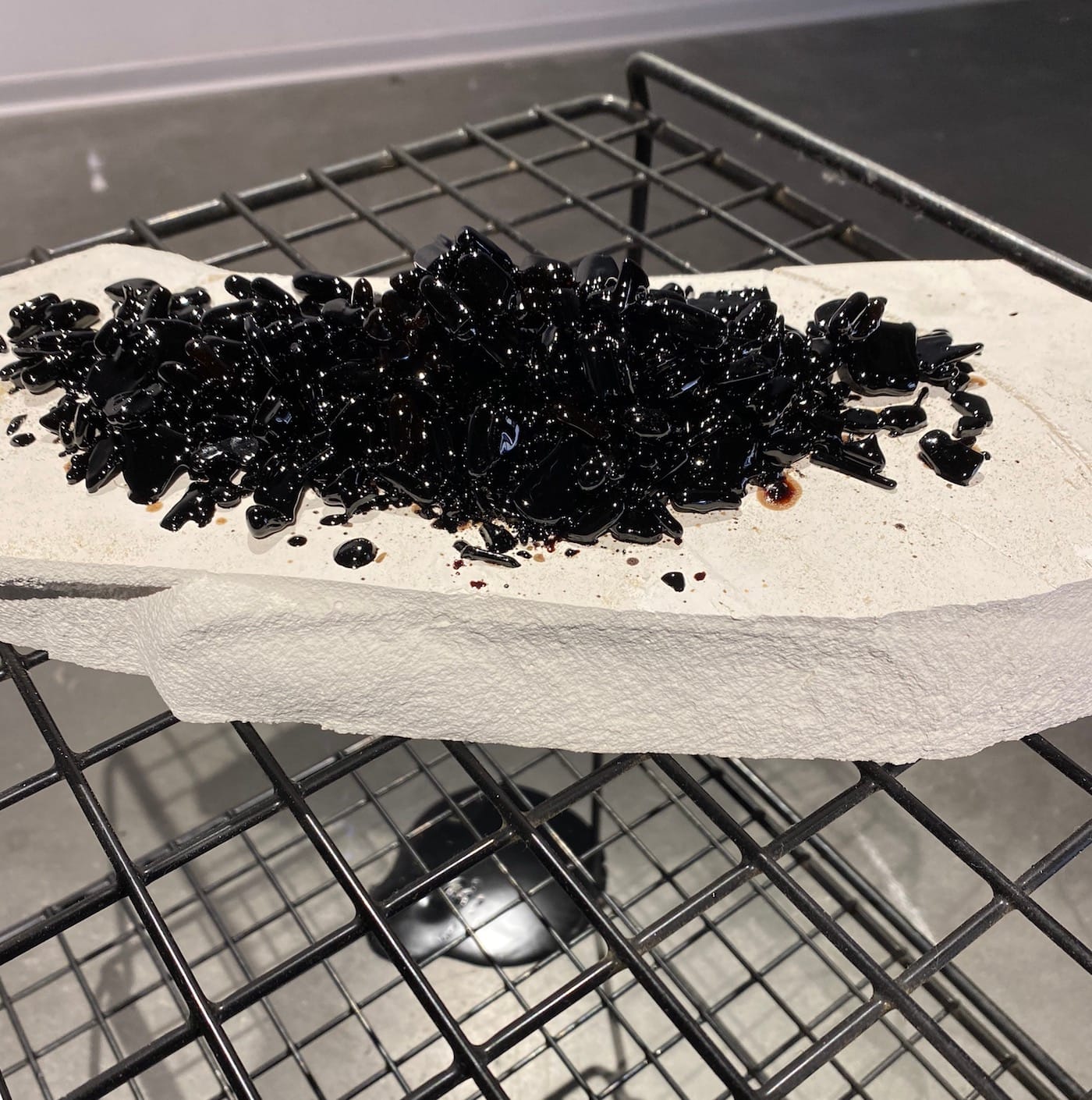 Jiyoon Kim takes mundane daily rituals, like beautification and pain management, and amplifies them, turning them into absurd, self-perpetuating machines or minimalist markers of entropy. In one work, a constantly running motor-driven cement-grinding wheel — modeled on a traditional Korean version (Kim is originally from South Korea) — grinds Advil tablets to dust. A wooden stick tied to the wheel makes a clacking noise as it revolves: meditative at first, maddening as it goes on. She also casts pills in burnt sugar, which slowly decompose into a glossy, black pool by the show’s end, aesthetically seductive but inert.