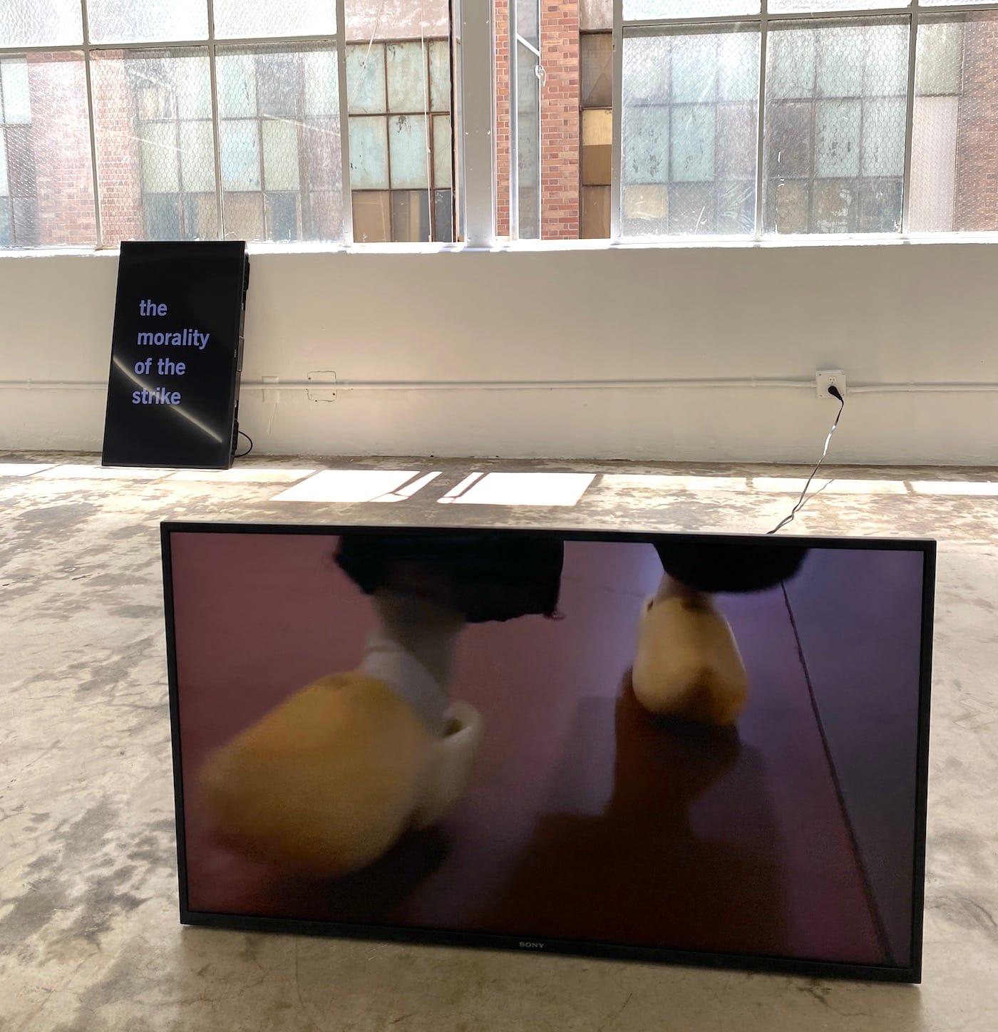 Olivia Leiter’s Sabot (2021) is a two-channel video featuring a close-up of feet noisily walking in wooden clogs paired with text from labor leader Elizabeth Gurley Flynn’s 1916 treatise on sabotage, a word whose etymology can be traced back to the wooden shoes, or sabots, that workers collectively stomped in to disrupt production. Leiter stages her own one-woman protest, wearing her clogs to sites of finance and commerce in LA such as malls and Metro stops, a surreptitious disturbance and call for collaborators.