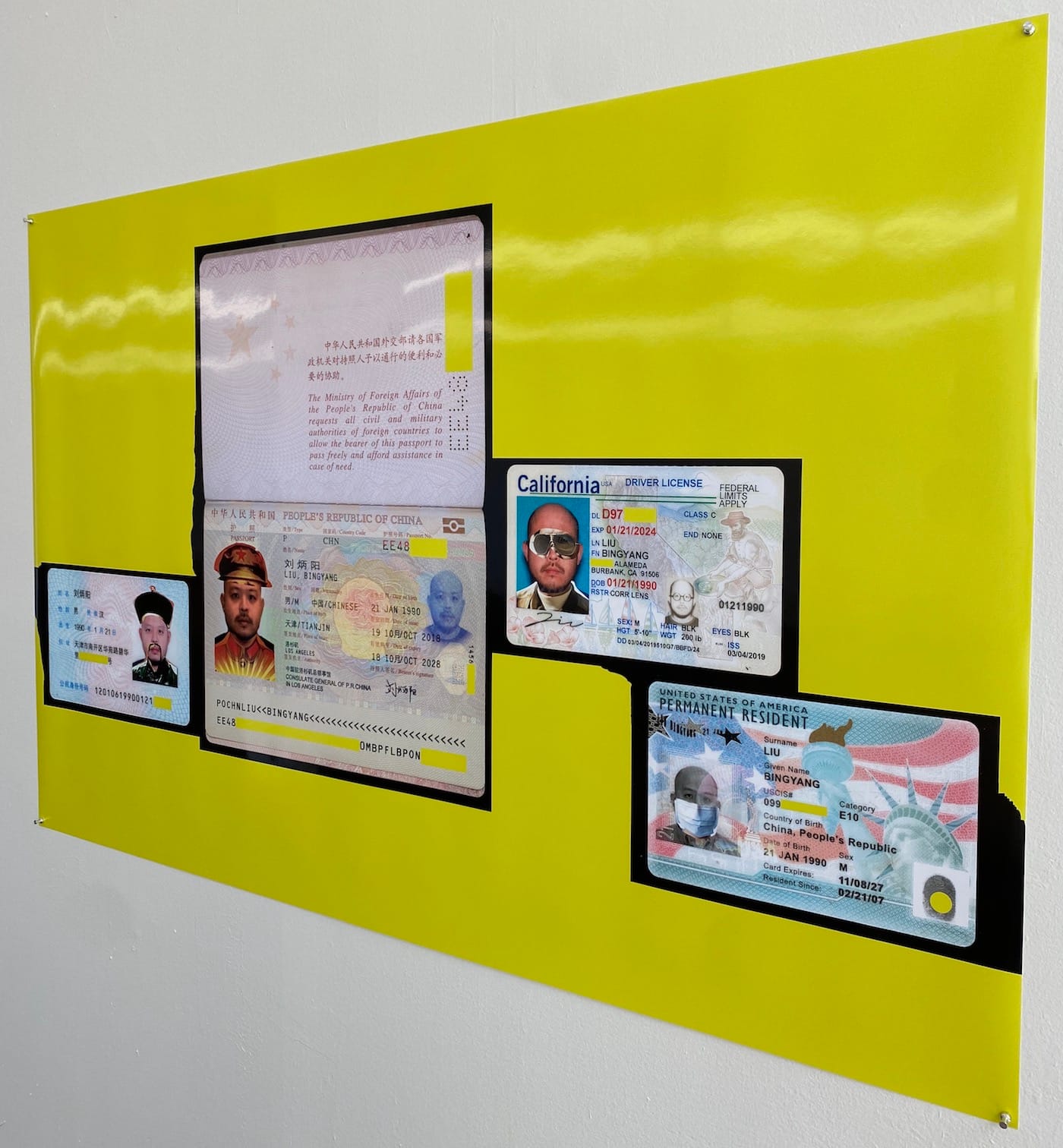 Bingyang Liu’s “Yellow Peril” is a large inkjet print featuring four forms of ID the artist uses. Onto each, the Chinese-born artist has awkwardly photoshopped different attributes: sunglasses onto his California driver’s license, Communist Chinese military garb onto his Chinese passport, a face mask onto his US permanent resident card. The humorous additions speak to the slipperiness of his identity as a Chinese artist residing in the US. “Měi guó rén” (American person or people) is a video documentation of a book Lui made based on Robert Frank’s seminal 1958 photobook The Americans. Unable to access the book’s content via online search engines in China, he instead searched for each photo’s title — Charity Ball, American Buffet, etc. — and created a book modeled on Frank’s with grids of his search results overlaid on Frank’s images. True to the collaborative spirit of this group, Schaedel said he plans to print a larger run of Liu’s book through his publishing company Fulcrum Press, adding another link to Liu’s global game of telephone.