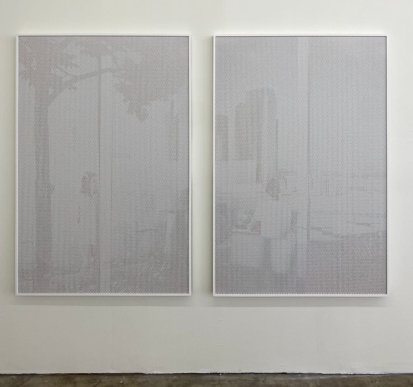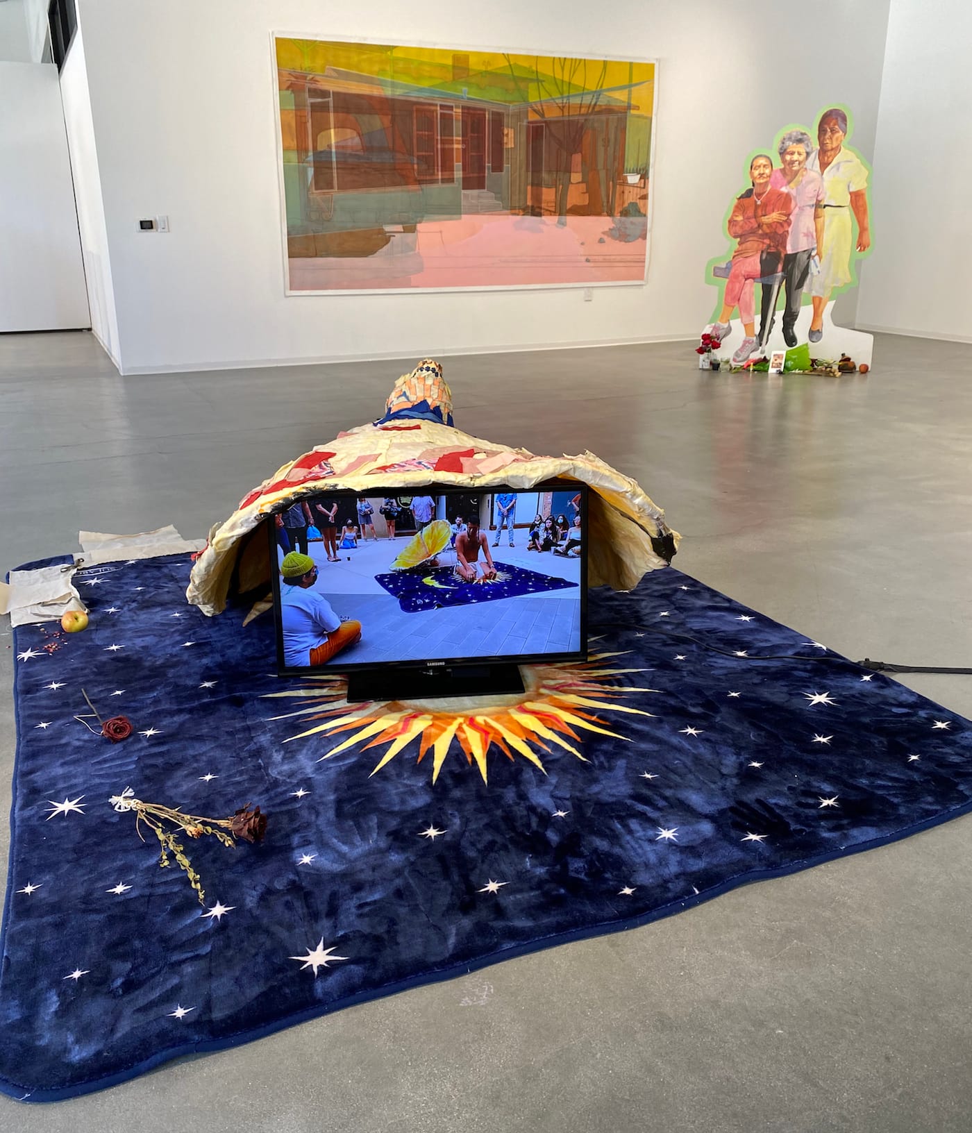 José Guadalupe Sánchez III makes visible the familial bonds that connect the living with those who've passed on. A painting on the wall composed of overlapping architectural renderings reveals a pastel palimpsest of family homes, collapsing time and space. Freestanding panels depicting generations of matriarchs serve as altars, with a small ledge at their base for offerings. Visitors to "Para Acompañar" were asked to bring something to leave for the ancestors portrayed in Sánchez’s paintings. In the center of the gallery, a monitor documents a performance in which Sánchez donned a large hat, while the audience repeatedly asked “How are you Jose?”, forming new strands of extra-familial connection.