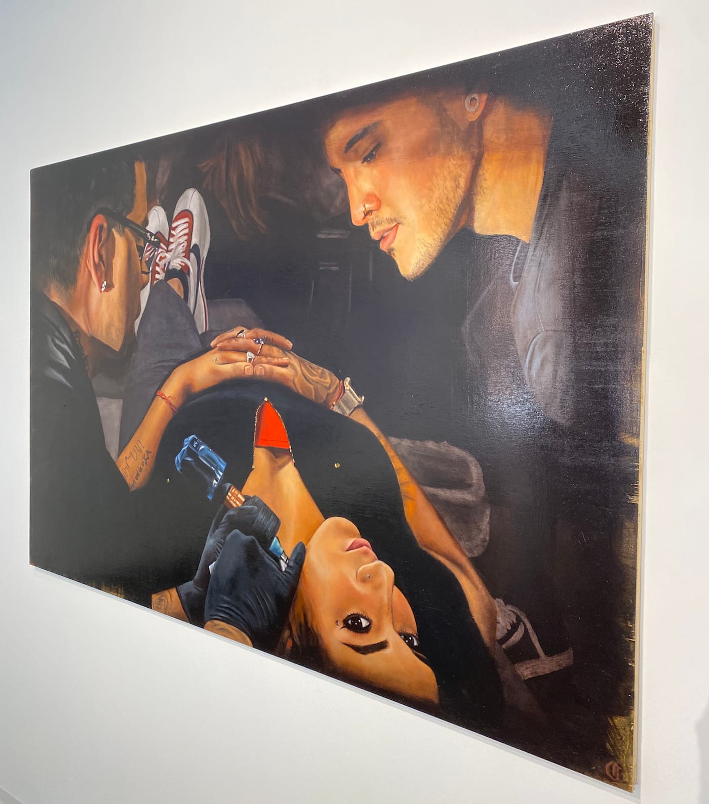 With a successful career as a tattoo artist and a background in “fine” arts, Danie Cansino’s work pokes holes in the high art / low art dichotomy. Her oil on plywood paintings depict tattoo parlor scenes with the gravitas and dramatic chiaroscuro of Caravaggio or Rembrandt. Instead of period figures however, her subjects are her friends, colleagues, and herself. Alongside these monumental works are ballpoint pen on paper works that elevate the medium familiar to any daydreaming student. A sweeping hillside landscape depicts Chavez Ravine, the predominantly Latinx neighborhood where Cansino’s great-grandfather lived, that was razed in 1959 to make way for Dodger Stadium. Titled “Dodger Blue” the work speaks to the complicated relationship that many Latinx Angelenos have with the baseball team: a connection to the contemporary Dodgers mixed with unease at the historical trauma inflicted upon their community.