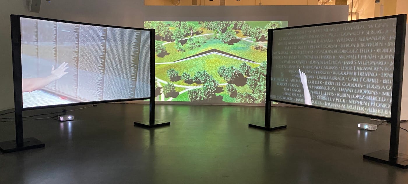 Rachel Zaretsky’s three-channel video installation captures the possibilities and limitations that living life online offers. Unable to travel during the pandemic, Zaretsky “visited” Maya Lin’s Vietnam Memorial purely through online portals like Google Maps, Trip Advisor, Instagram, and YouTube. From myriad firsthand digital accounts, she collaged together a composite experience of being at the site and walking the length of its stark black, granite V-shape, with her disembodied arm guiding the viewer. There's a tension between the intimate, layered personal traces and the fact that Zaretsky was never able to experience the physical name rubbings or be near other visitors.