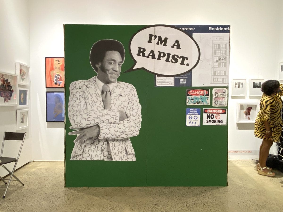 The centerpiece of the show isKhidr Joseph's installation "Untitled (Uncle Bill)" (2021) at the booth of the LA-based Dominique Gallery. Against a life-sized hunter green plywood wall enclosure that resembles the fencing erected around construction sites, complete with graffitied-over hard hat signage, Joseph has wheat-pasted a black-and-white photograph of a grinning Bill Cosby with a speech bubble announcing, "I'm a rapist." The work is a replica of a mural the artist created in Bed-Stuy, Brooklyn this July, when the disgraced entertainer, accused of sexual misconduct and assault by over 50 women, was released from prison.