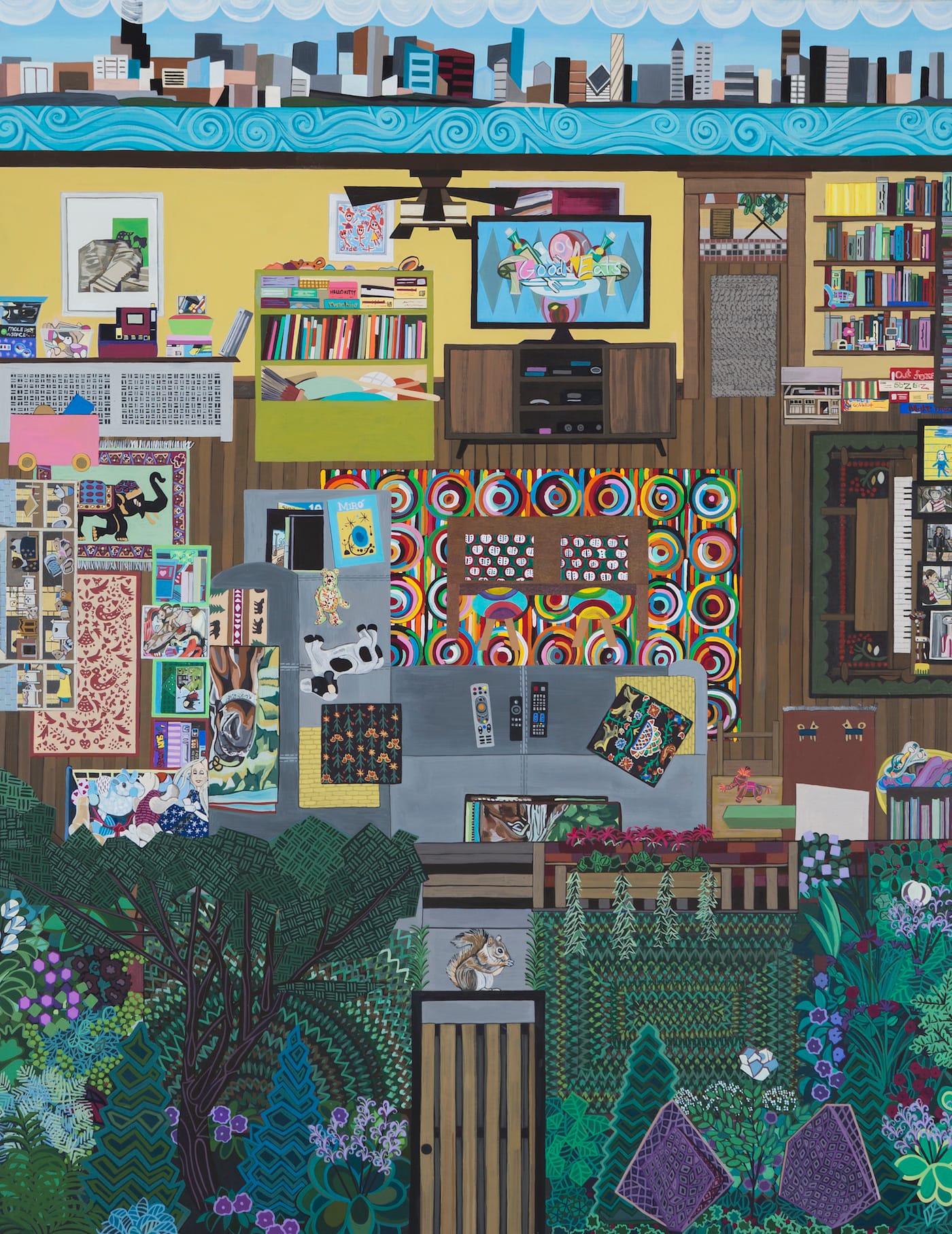 Both artists love pattern. McEneaney exploits repeating elements such as floorboards, brickwork, leaves, fabric, and flagstone, designing with exaggerated perspective and funky spatial shifts characteristic of late medieval painting. Toebbe, who draws on Persian miniature traditions, takes pattern farther, submitting her entire image to the dictates of rhythm. Unruly foliage resolves into orderly geometric shapes, swimming pools become swirling blue spirals, while rugs, bookshelves, and floorboards become pulsing arrangements within the larger scheme. Toebbe’s tidy vivisections contain sudden shifts that break the logic of the painting’s structure but help maintain coherence. The entrance to the house in “Family Room (Sister)” should be upside-down in keeping with the way the house has been split open, but is depicted upright as though we are seeing the house from the street. The two artists’ use of pattern is their greatest common ground, a shared sensitivity to the ways in which small details of our lives coalesce into the larger rhythms that define us.