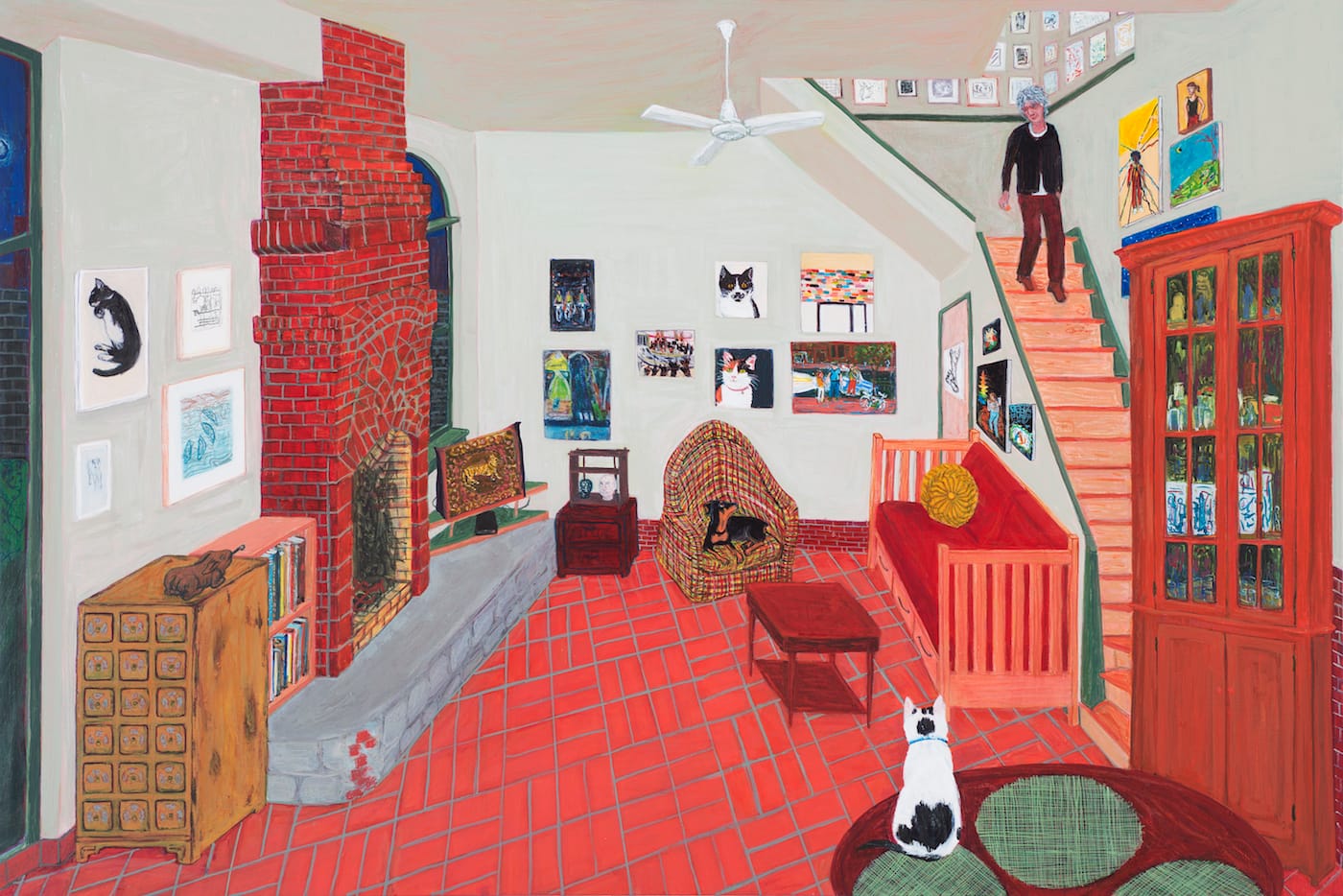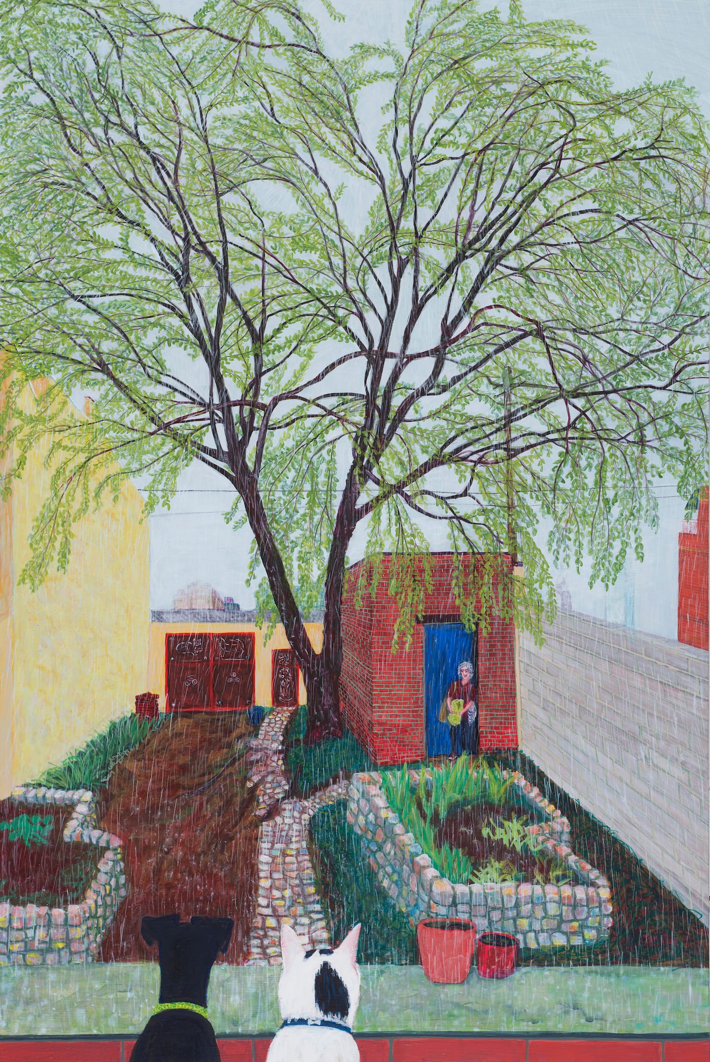 McEneaney places the viewer directly inside her home, herself appearing in each work, along with her dog and any combination of her three cats. She sits at her computer; shelters from the rain with an armload of groceries; draws, paints, and teaches her dog to sit and stay; she walks downstairs. Our viewpoint is intimate, generally no more than a dozen feet removed. McEneaney is a luminous colorist, applying acrylic in thin coats that allow earlier layers to glow through. In “Spring 2017” (all works by both artists are from this year), red brickwork buzzes against a leafy green tree on the left, a cerulean sky above, and the vermillion wall of her studio to the right. Her color is a heart turned outward.