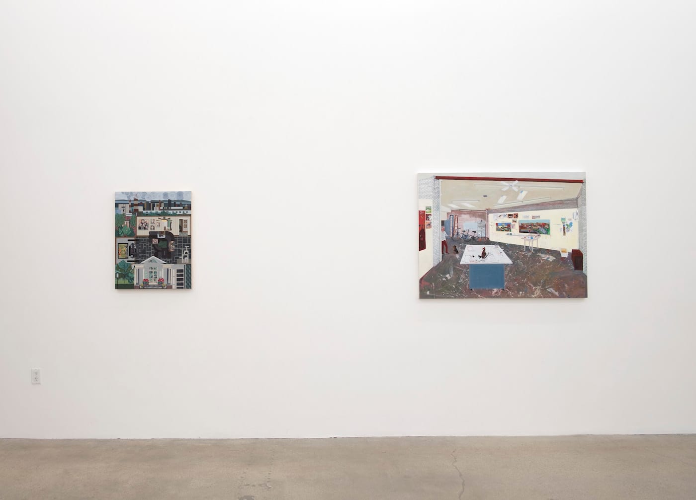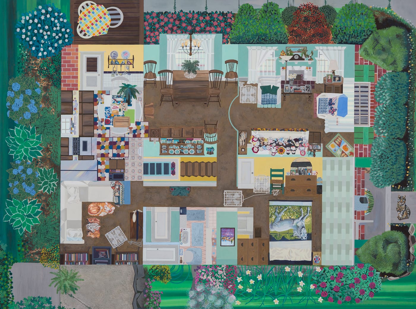 Working in gouache, Toebbe paints god’s-eye views of houses, splayed and flattened as one would a cardboard box, revealing the personal possessions of the inhabitants with the focus on the living room and kitchen. This divine perspective is the impersonal gaze of an omniscient creator that stays out of human affairs. Yet objects are detailed with humor and affection: kitschy throws, embroidered pillows, plates emblazoned with the US flag, children’s toys, shelves of books, and the television. Devoid of people, each interior luxuriates in the serenity enjoyed by the furniture when nobody’s home. Toebbe’s palette is an introverted, beguiling spectrum of muted greens, grays, browns, pale yellows, and quiet pinks, well suited to houses that seem contained in an impermeable membrane.