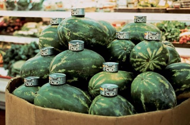 What makes Orozco’s work so great to me is that he manages to find the poetry hidden in just about anything. Just check out his alternately hilarious and surreal photograph of cat-food cans balanced on top of watermelons at a grocery store (seen at top). The piece shows an artist making work out of the substance of daily life.