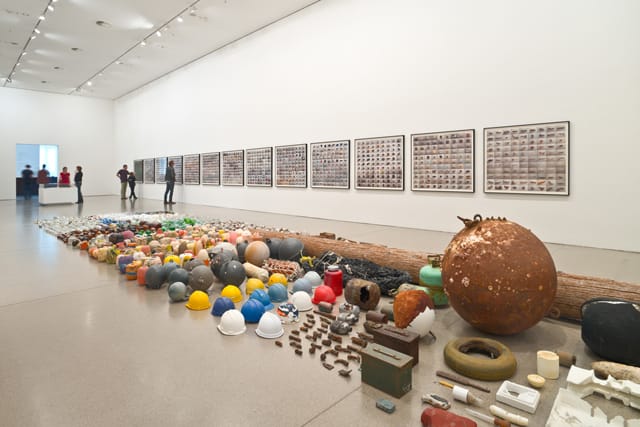 Orozco’s latest project actually shows a return to his early appropriation strategies. His current exhibition at the Guggenheim, Asterisms (seen above), consists of a vast field of found objects collected from the same landscape the whale came from, an array of detritus organized into a composite sculpture. That piece is set off with another collection of junk from a New York City astroturf field — candy wrappers, gum, and thread.