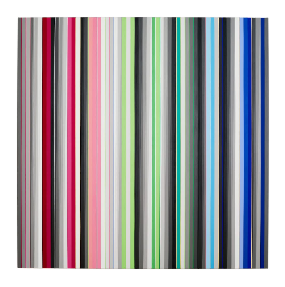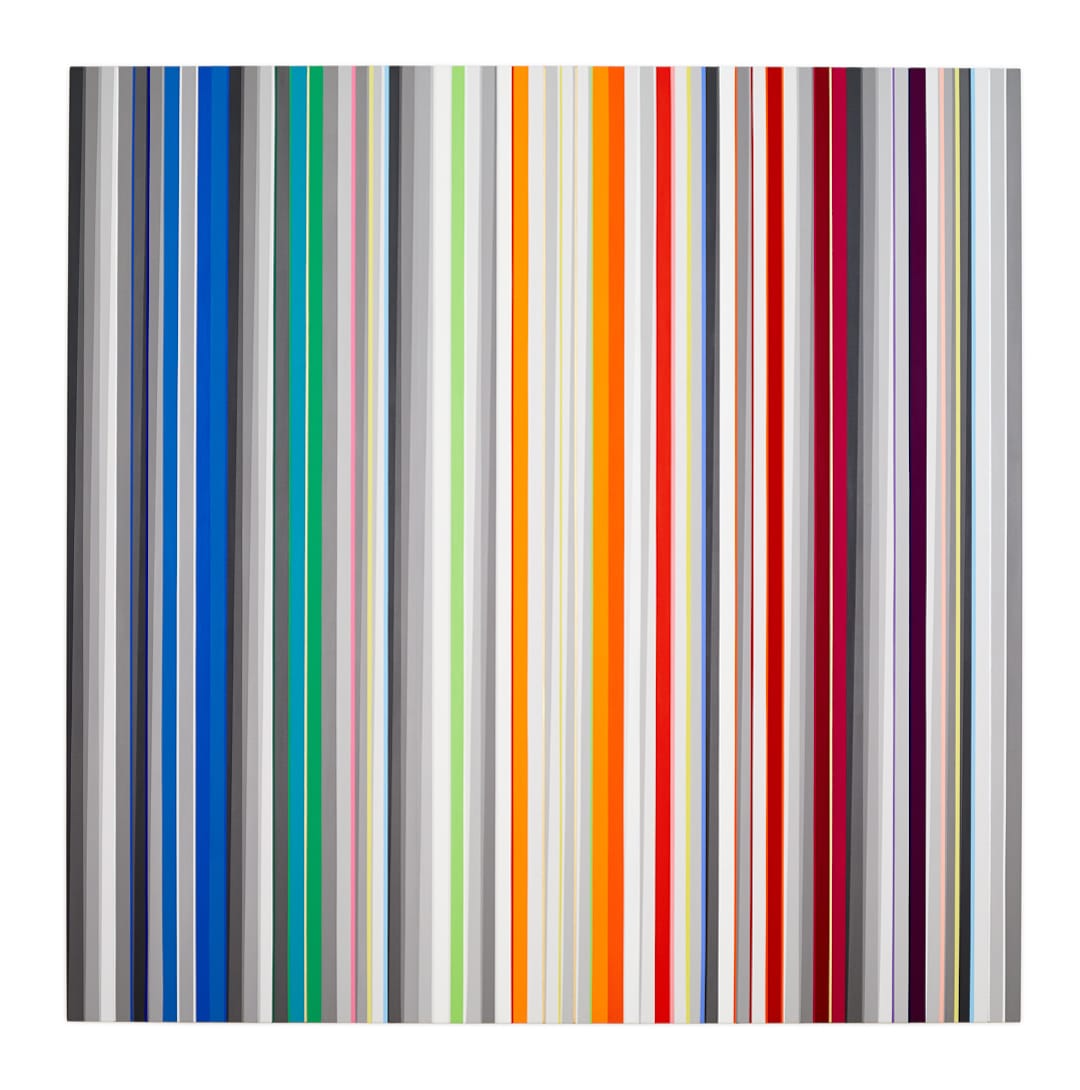 Evertz’s two recent paintings are done in her signature vertical lines and bands of color interwoven with vertical clusters of gradated gray bands, which taper in a calculated way from the painting’s bottom edge to its top, and vice versa. While Evertz’s work might evoke comparisons with the chromatic abstractions of Gene Davis, the differences between them are sharp and profound.