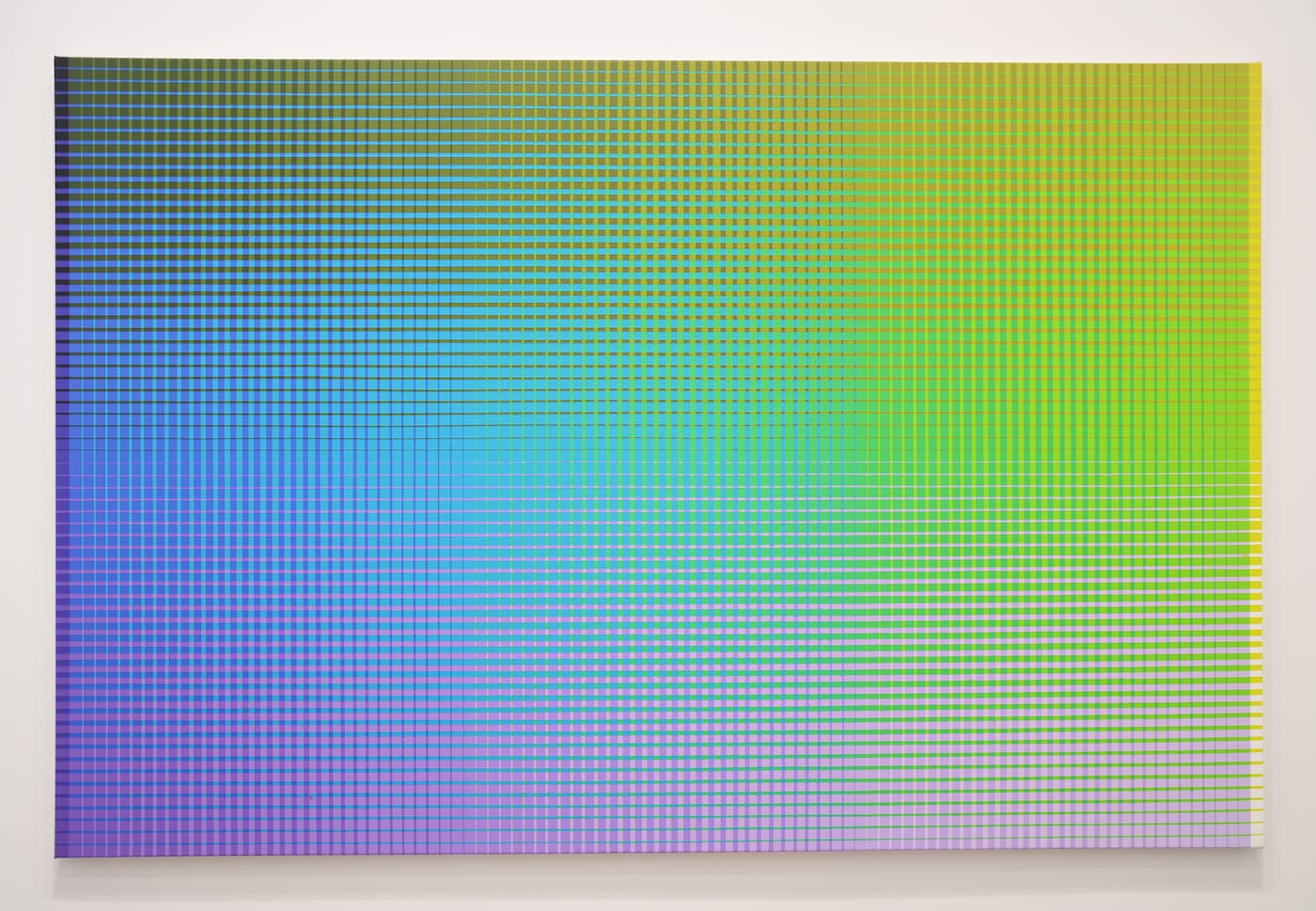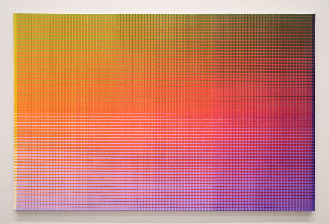 There is the experience of standing close to the paintings and studying the meticulous ingenuity of a structural grid whose overlaid, off-register vertical and horizontal bands increase incrementally, with the colors occupying the gridded spaces increasing or decreasing in tandem with the grid. And yet, even as one becomes aware of Wurmfield’s technique, what happens optically is spellbinding.