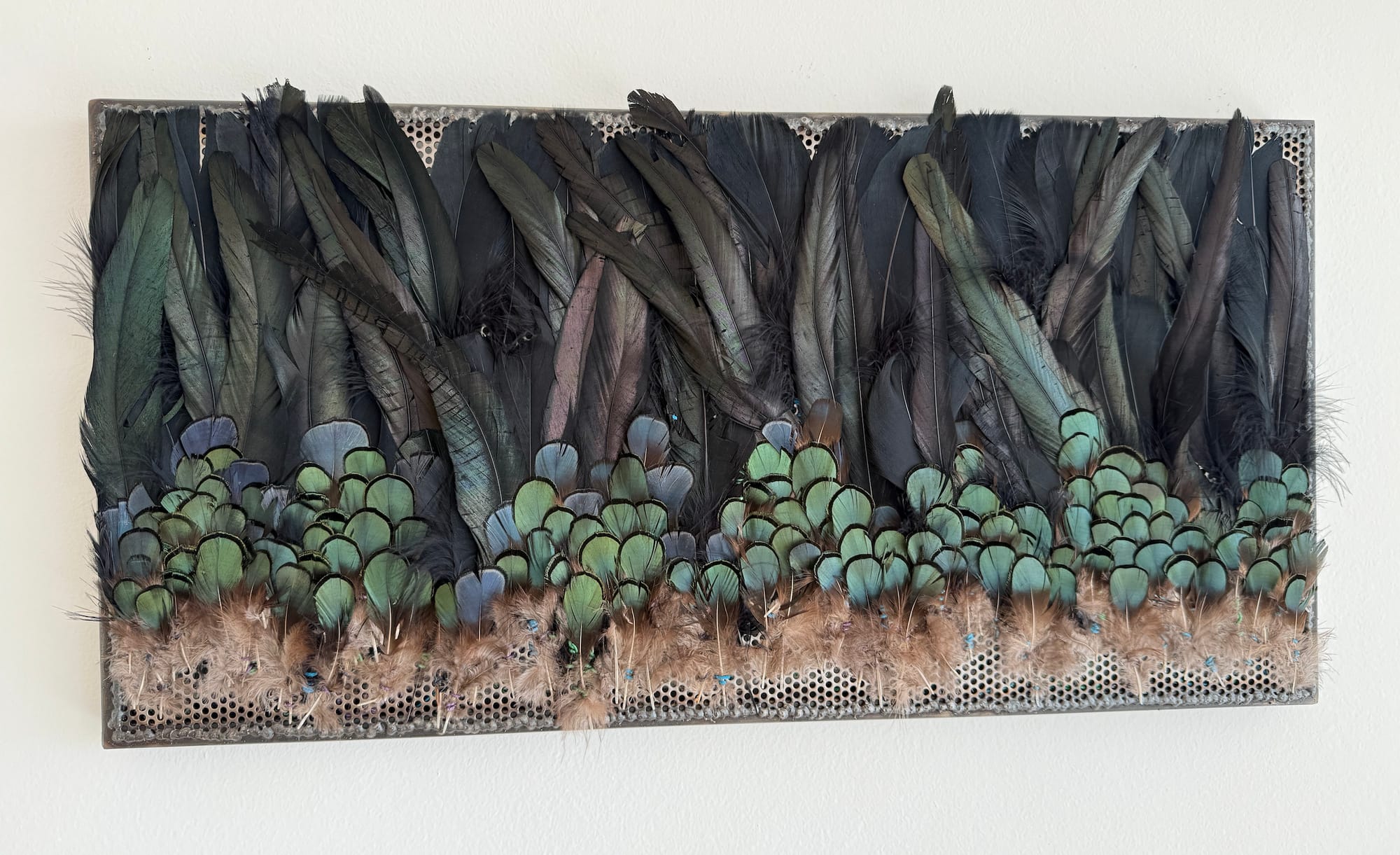 Placed on a ridge outside the house, Sarah Espinoza’s “Regalos del Fuego” (2025) overlooks the city. Assembled from ceramics and objects found on the site of her home, which was destroyed in the Eaton Fire, it stands as a memento mori and a reminder of the precarious balance between beauty and devastation that is ever-present in LA.
