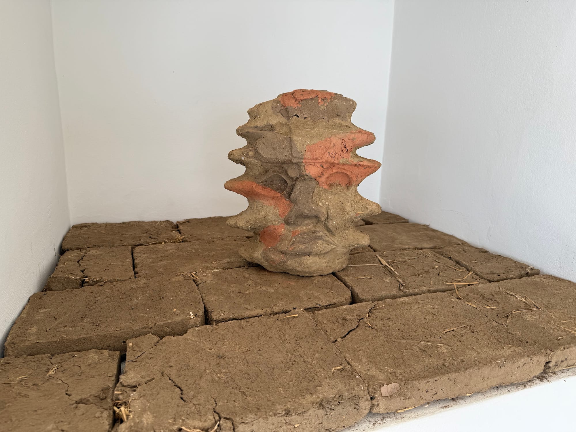 In the center of the living room sits “Ceiba” (2023), a steel sculpture of a ceiba tree — which represents a portal to the underworld in Mayan mythology — created collaboratively by Cortez, Phillip Byrne, and Tatiana Guerrero. Metal parasites sprout from the welded surface of the volcano-like structure, while organic rubber and Mylar forms bubble up from its interior, a representation of multi-species hybridity. Nearby is rafa esparza’s “Xolotl” (2018), an adobe dog that draws on geometric Mesoamerican precedents, its head craning up at the viewer with an air of naturalism.