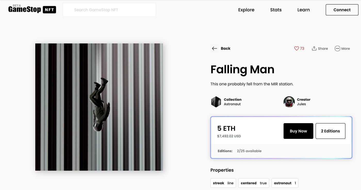 Hyperallergic was able to retrieve a screenshot of the original listing using Wayback Machine. In the NFT by Jules, a toy astronaut falls in front of a vertically striped background. "This one probably fell from the MIR space station,” the caption states, a possible reference to Russia's space station which was in operation until 2001. The cheapest version of the NFT was listed for 0.65 ETH (~$887 USD) and was bid up to 5 ETH ($6,800 USD) before it was taken down.