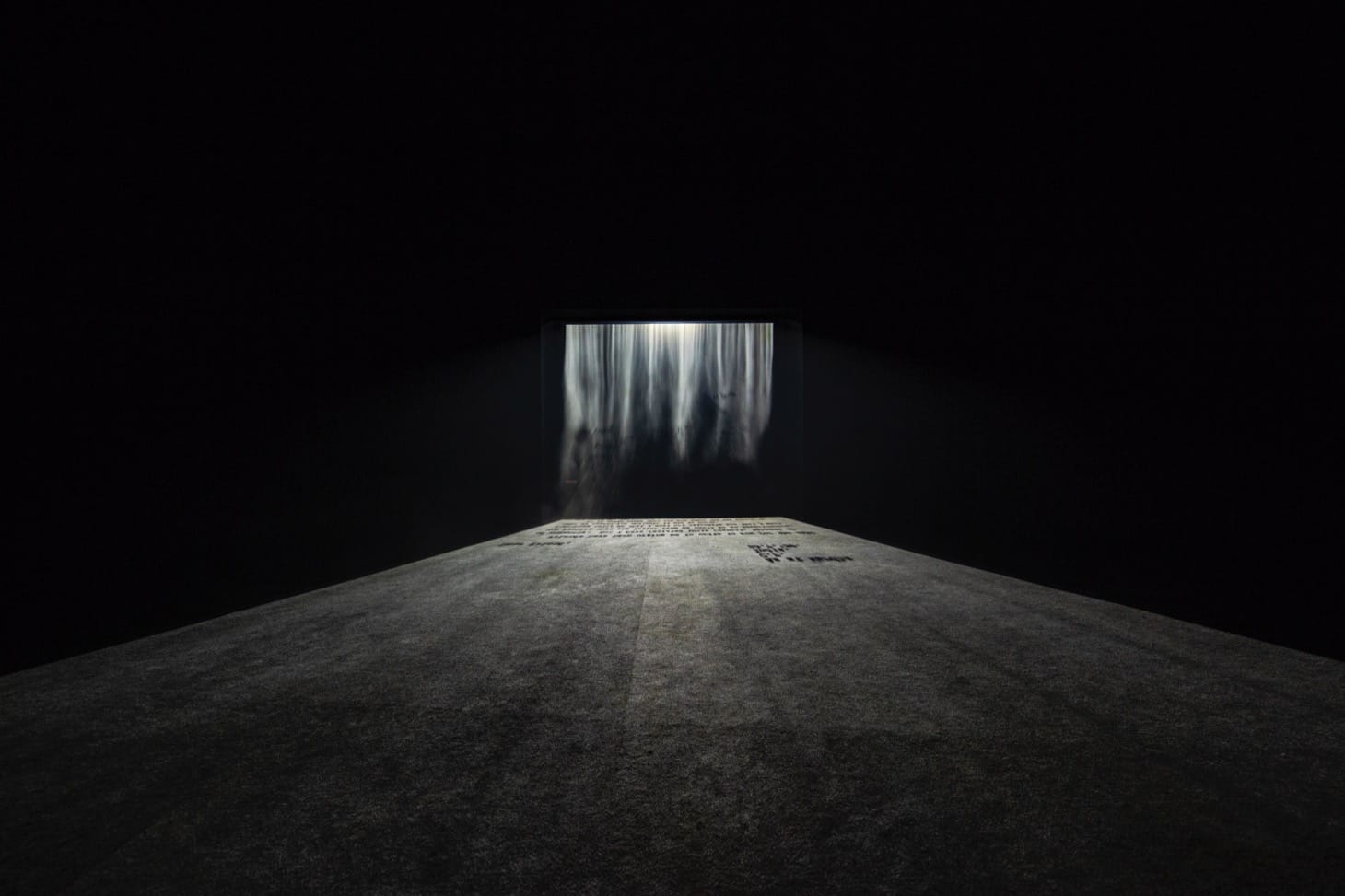 At the center of the pavilion, and opposite the “Haripura Panels,” is a dark room with the immersive work “Covering Letter” (2012) by Jitish Kallat. In July 1939, Gandhi wrote a letter to Hitler. Germany had just occupied Czechoslovakia, and it was about five weeks before the start of the second World War. The letter, which is only seven lines long, reads “almost like a haiku” says Kallat, who makes it the protagonist of “Covering Letter,” where he projects the text onto a thick layer of mist.