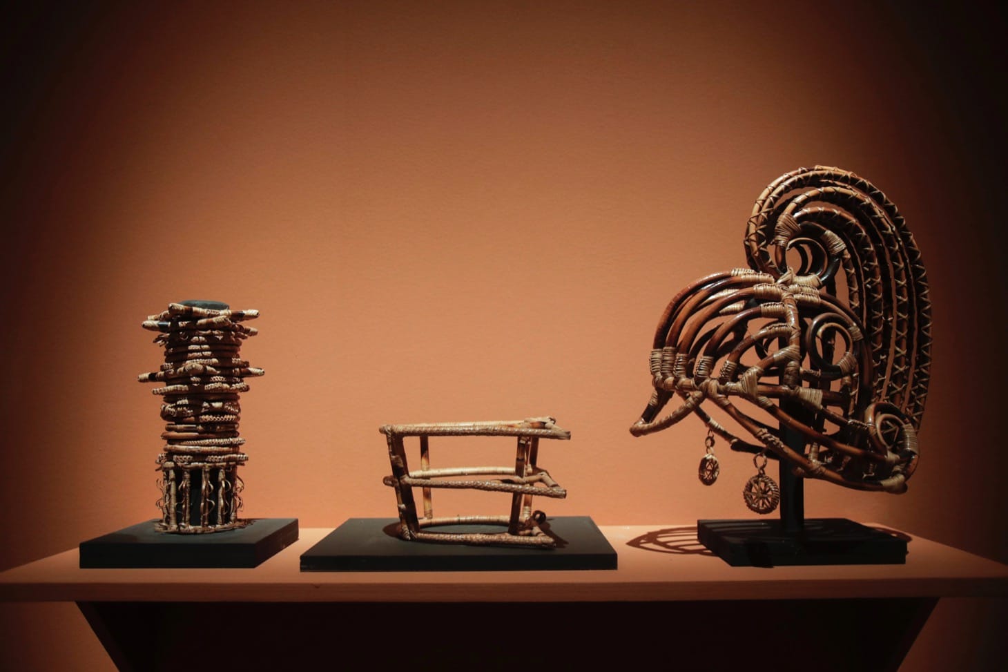 Our Time for a Future Caring primarily brings together the work of eight artists, from different generations, who have reflected on the Gandhian legacy of decolonization. This also includes M. F. Husain’s rolling, frieze-like, oil on canvas “Zamin” (1975), which sets the tone with its symbolic references to nation building and secular politics; Atul Dodiya’s nine wooden cabinets as part of “Broken Branches” (2002), which are delicately arranged with found objects like tools, prosthetic limbs, billboard paintings, and hand-painted photographs; Shakuntala Kulkarni’s cane armor and accessories from “Of Bodies, Armour and Cages” (2010–2012) in which she takes to the streets as a statement against the objectification of femme bodies; and the photographs of Gandhi’s grandnephew Kanu Gandhi, who lived with him for many years and intimately chronicled that time.